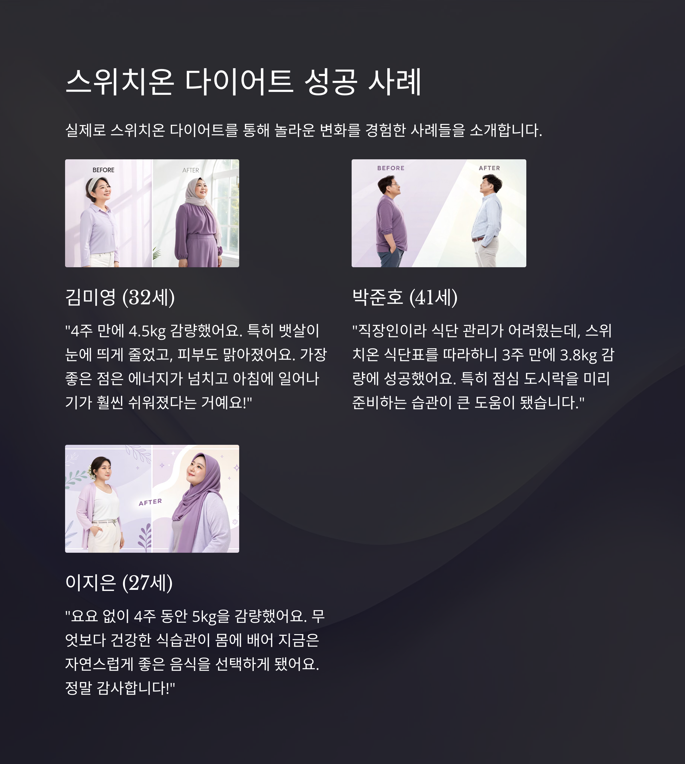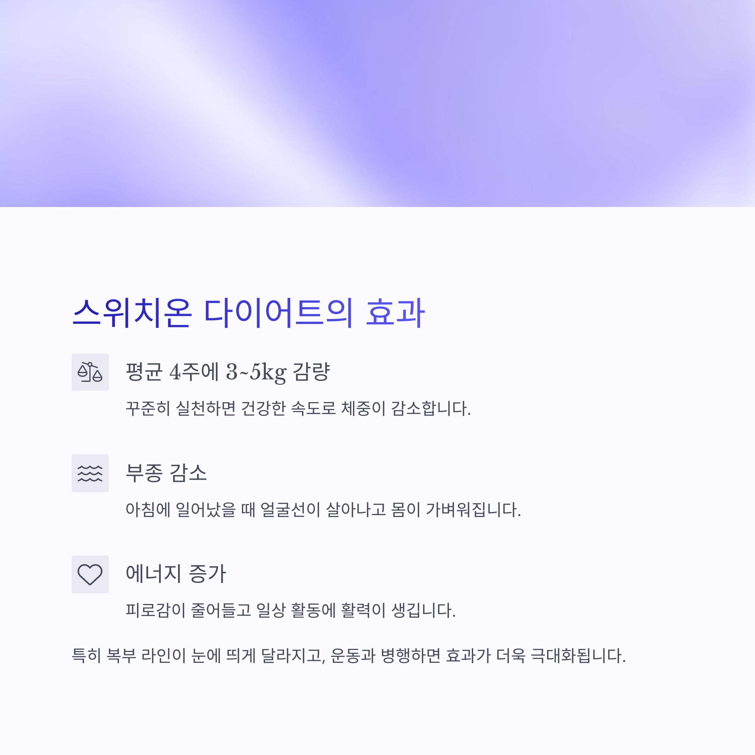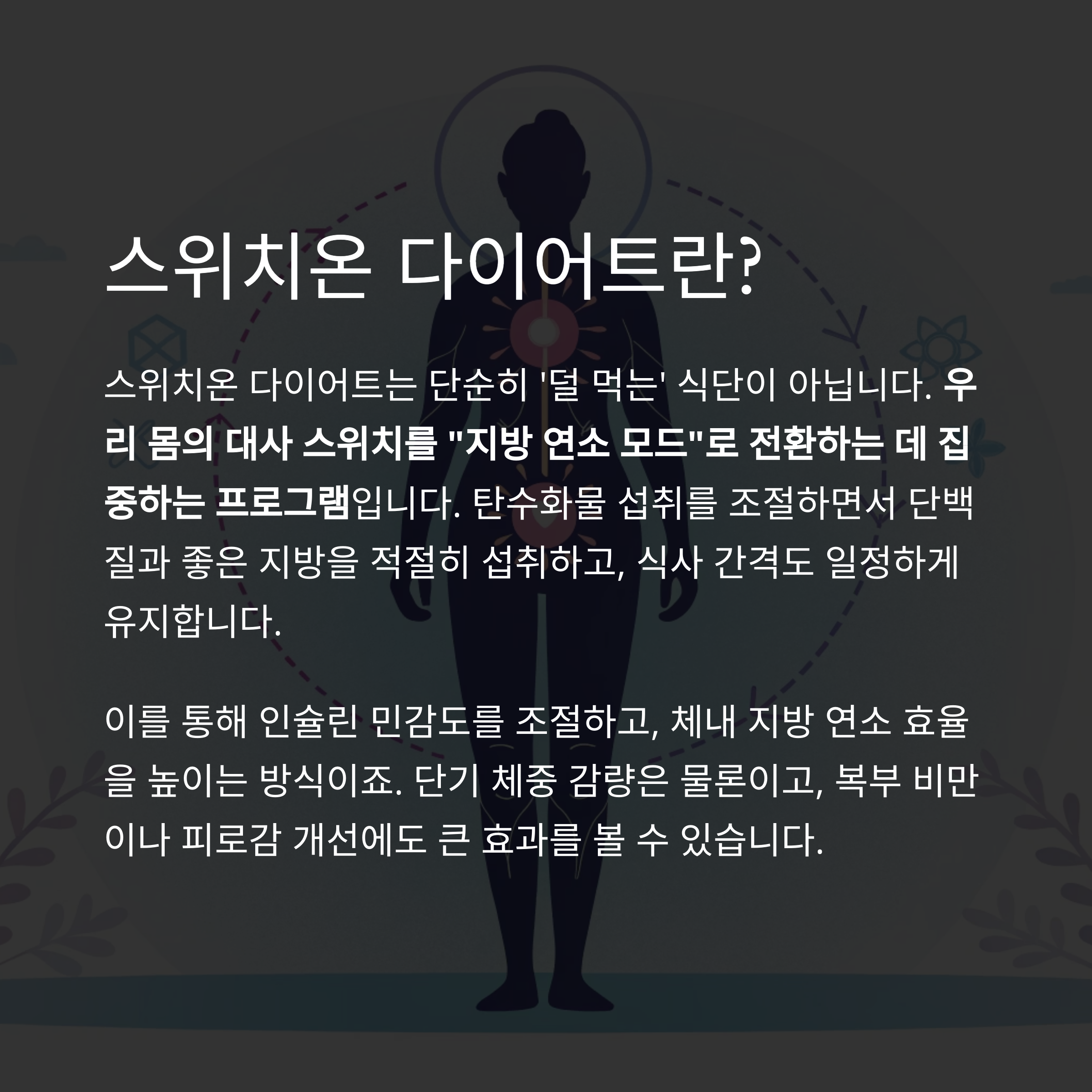 스위치온 다이어트는 단순히 '덜 먹는' 식단이 아니에요. 우리 몸의 대사 스위치를 "지방 연소 모드"로 전환하는 데 집중하는 프로그램이에요. 탄수화물 섭취를 조절하면서 단백질과 좋은 지방을 적절히 섭취하고, 식사 간격도 일정하게 유지해요. 이를 통해 인슐린 민감도를 조절하고, 체내 지방 연소 효율을 높이는 방식이죠. 단기 체중 감량은 물론이고, 복부 비만이나 피로감 개선에도 큰 효과를 볼 수 있어요. 저도 아침에 일어나는 게 한결 가벼워졌어요!
