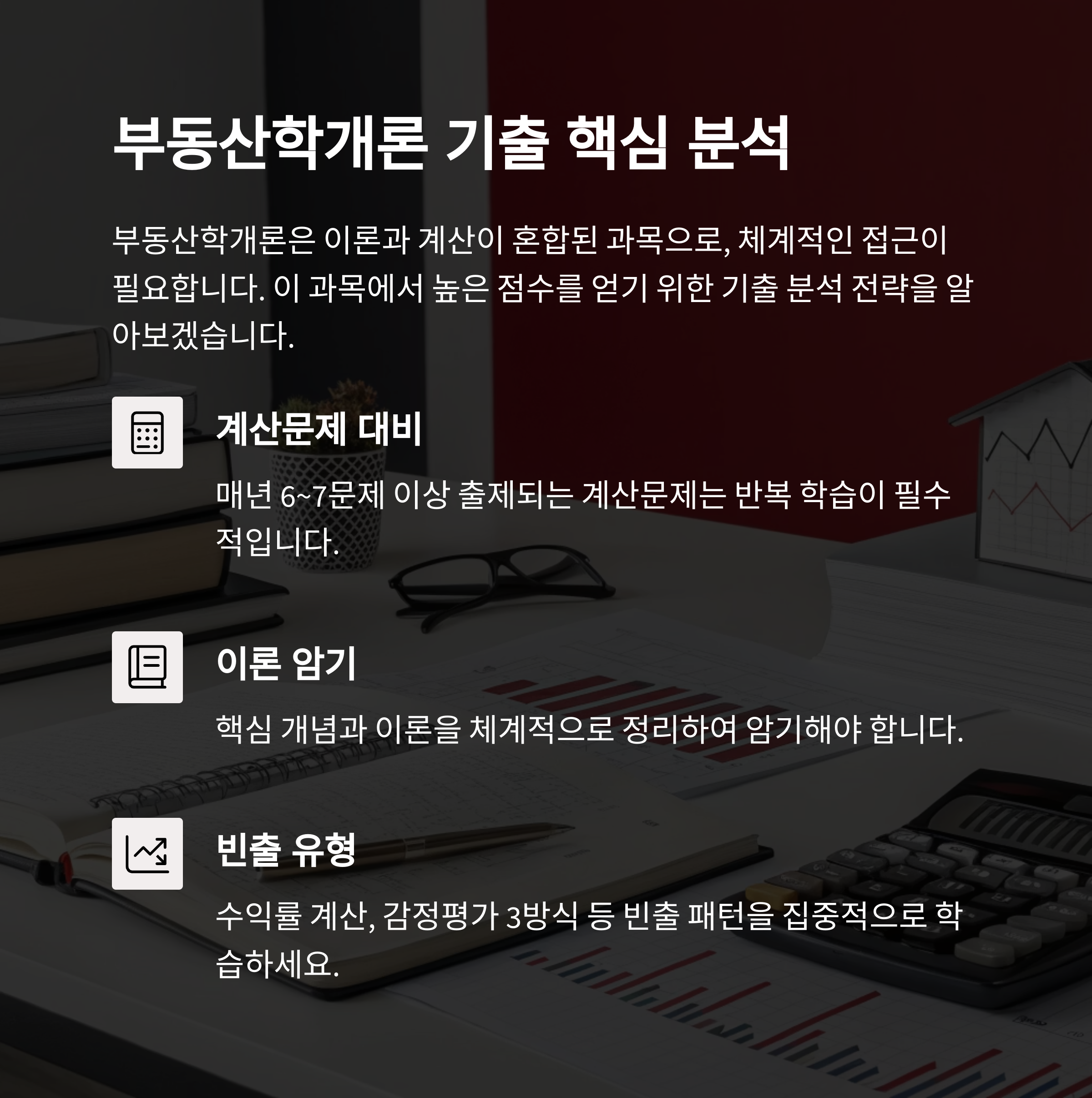 예를 들어, 수익률 계산, 감정평가 3방식 등의 문제는 빈출 패턴으로 분류됩니다.