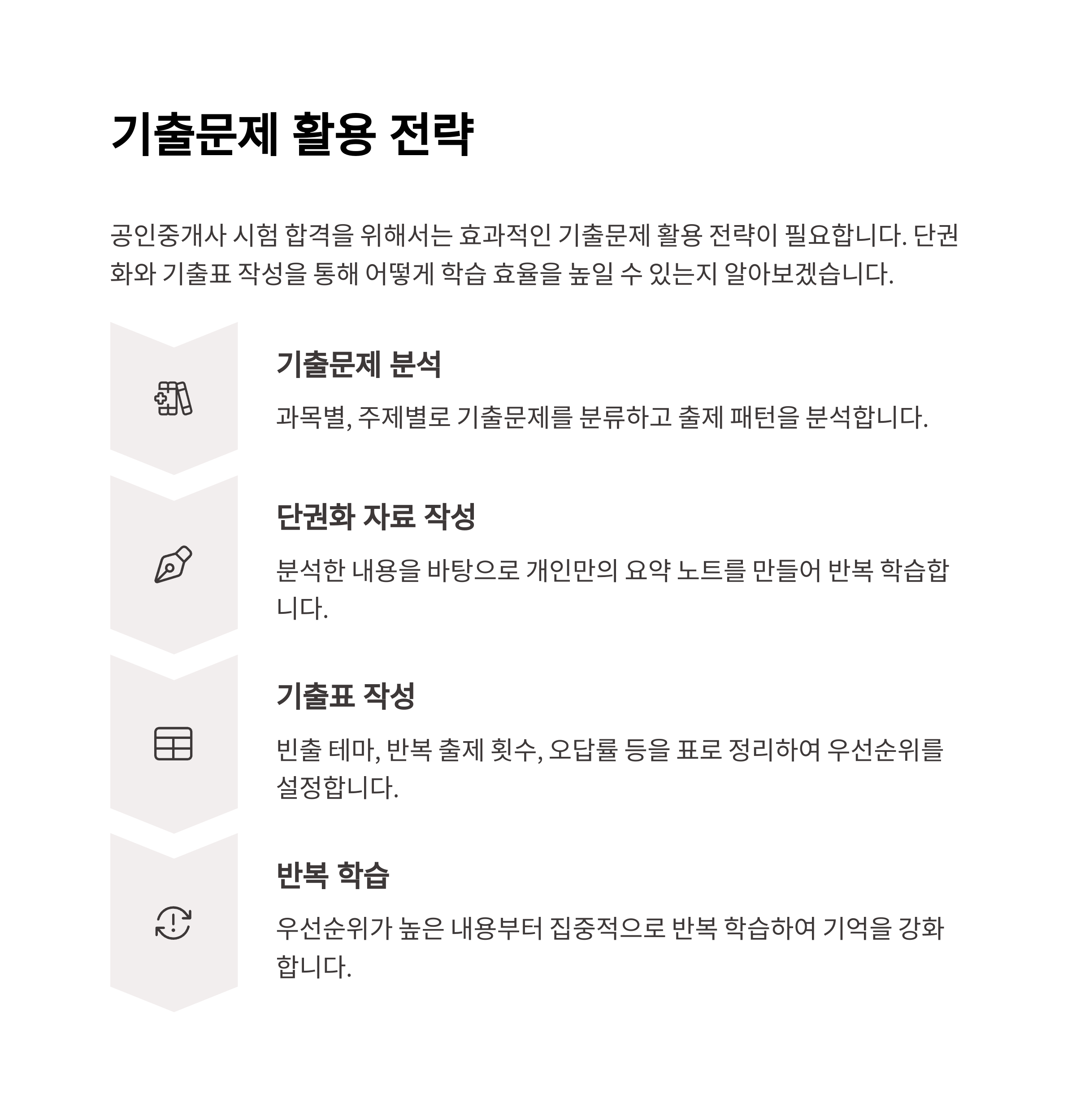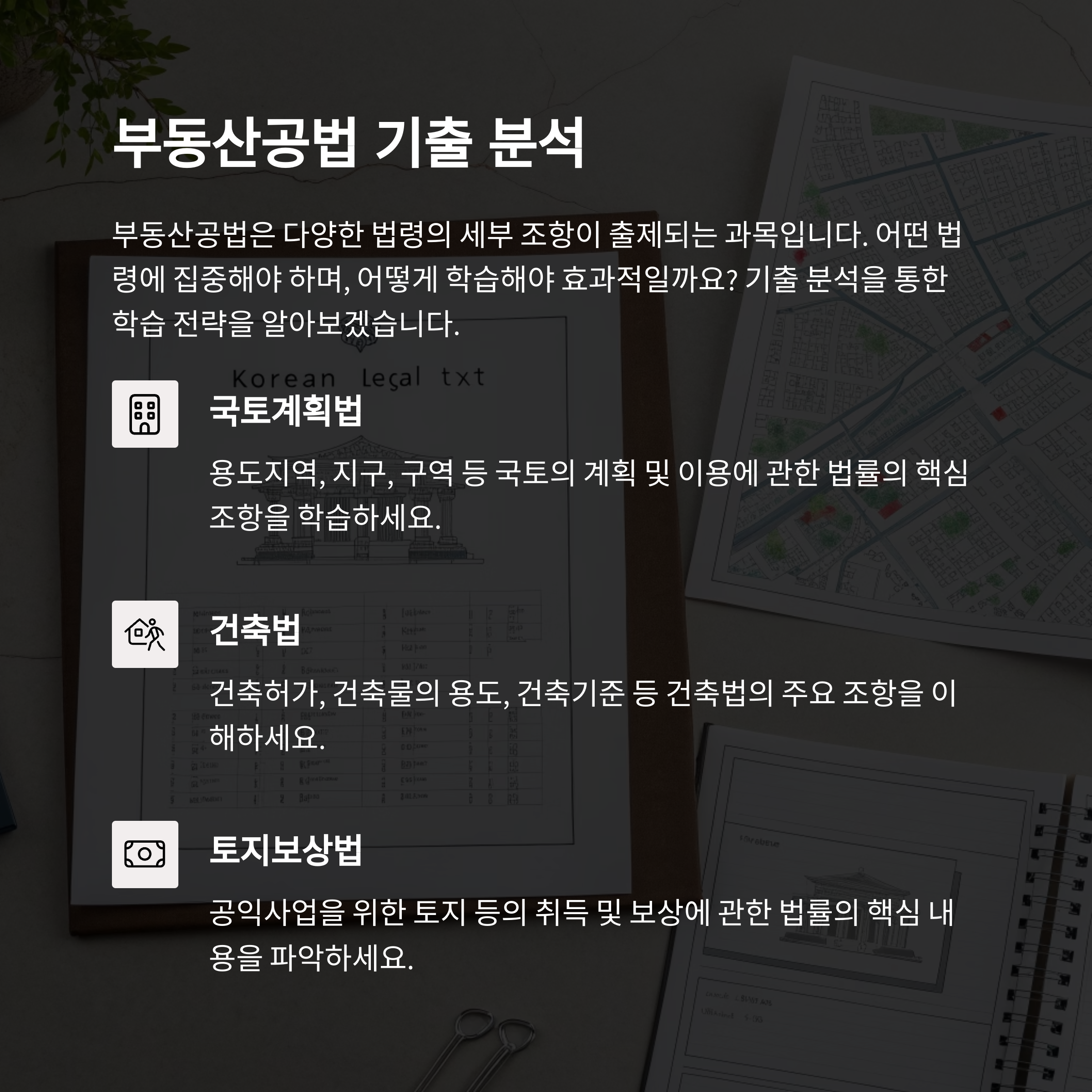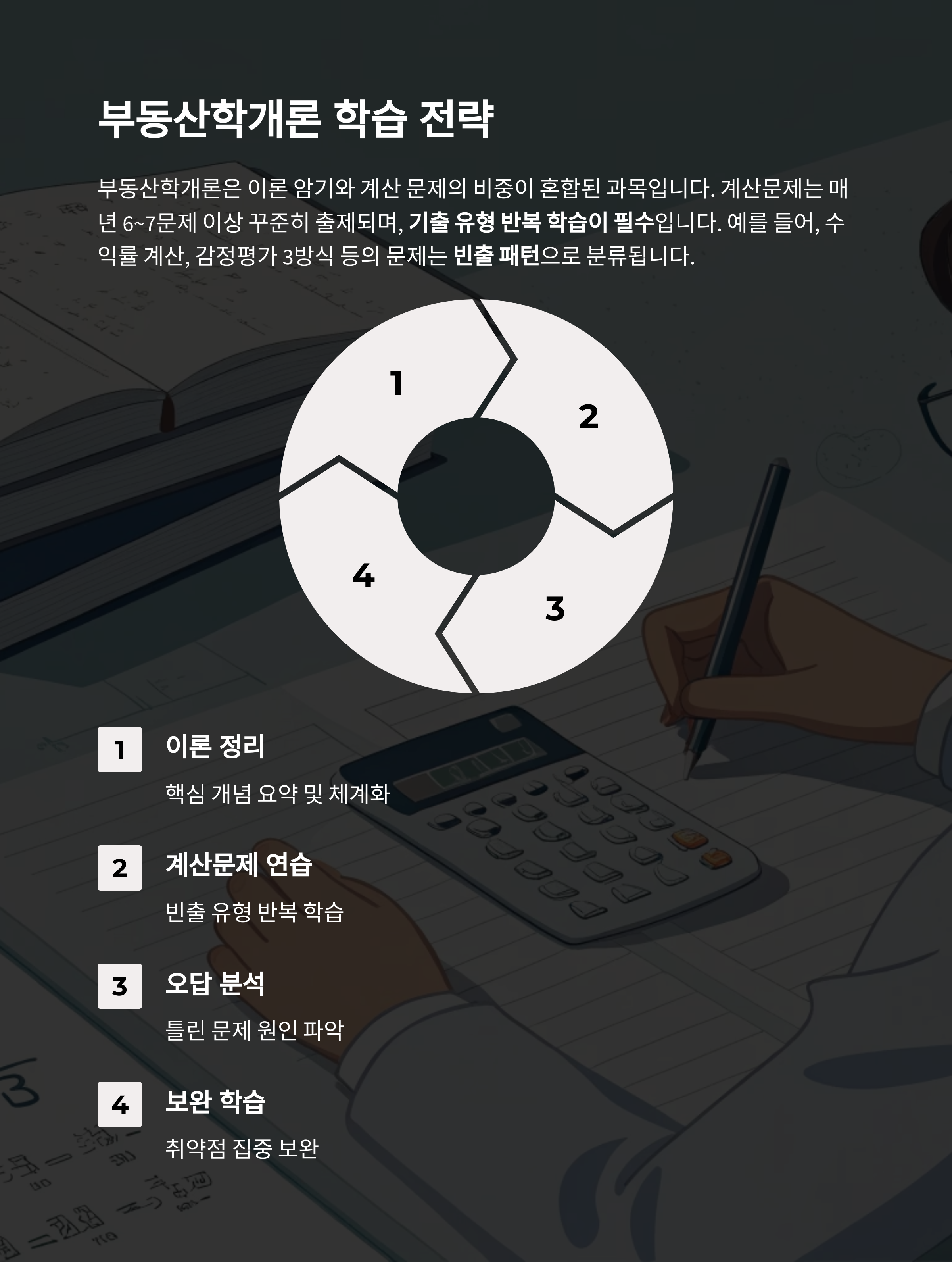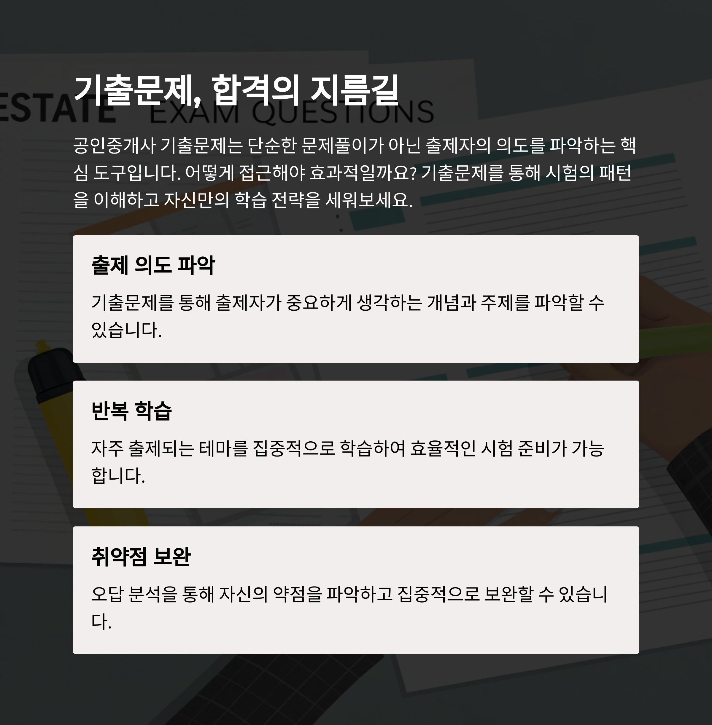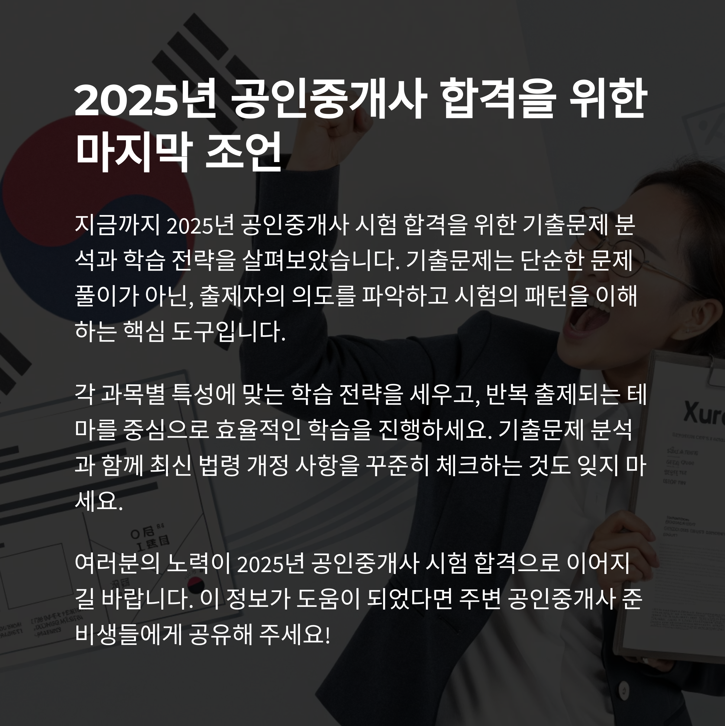 공인중개사 시험 합격을 위한 핵심 전략은 기출문제 분석과 유형 반복 학습에 있습니다.