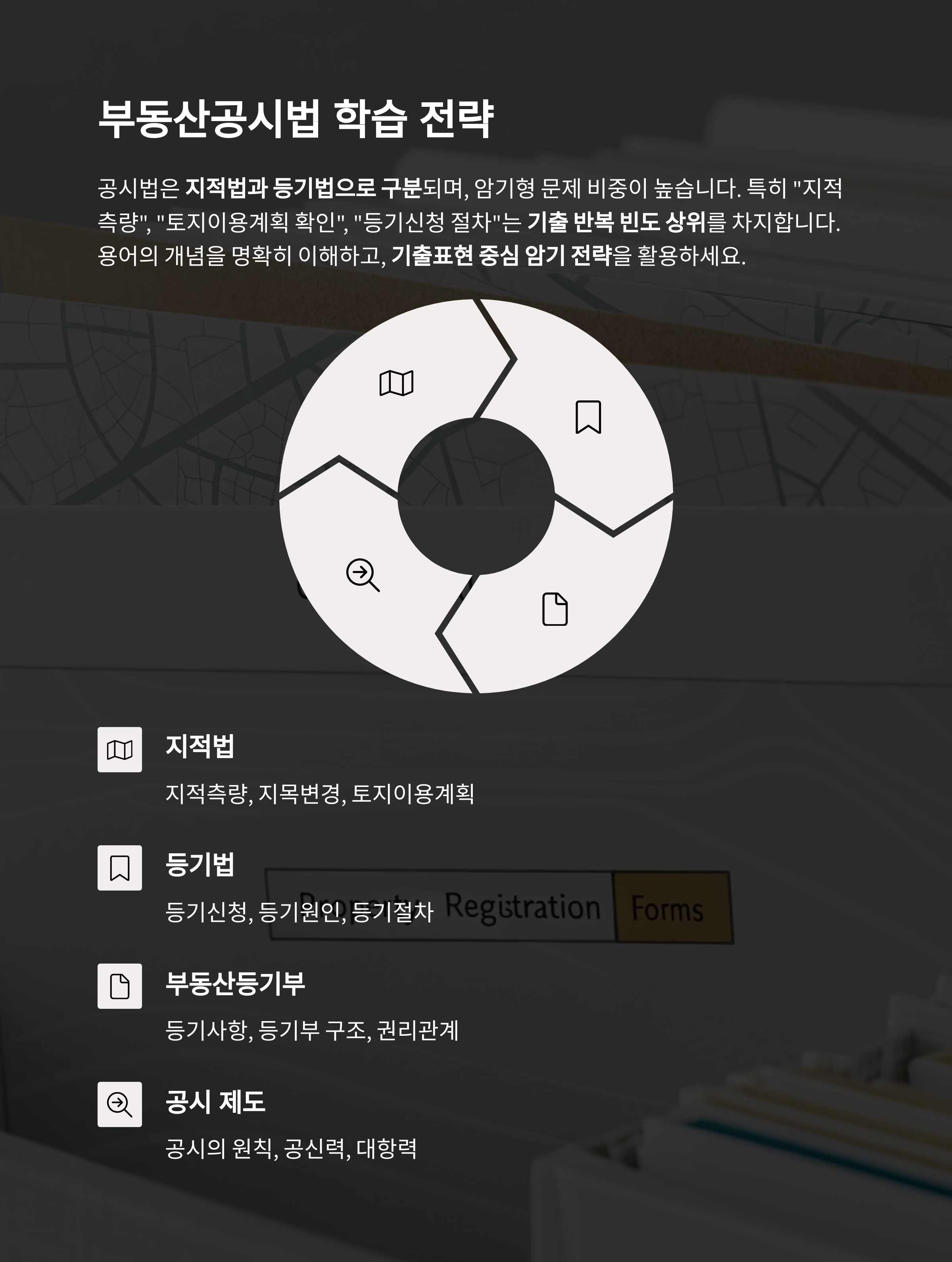 공시법은 지적법과 등기법으로 구분되며, 암기형 문제 비중이 높습니다.