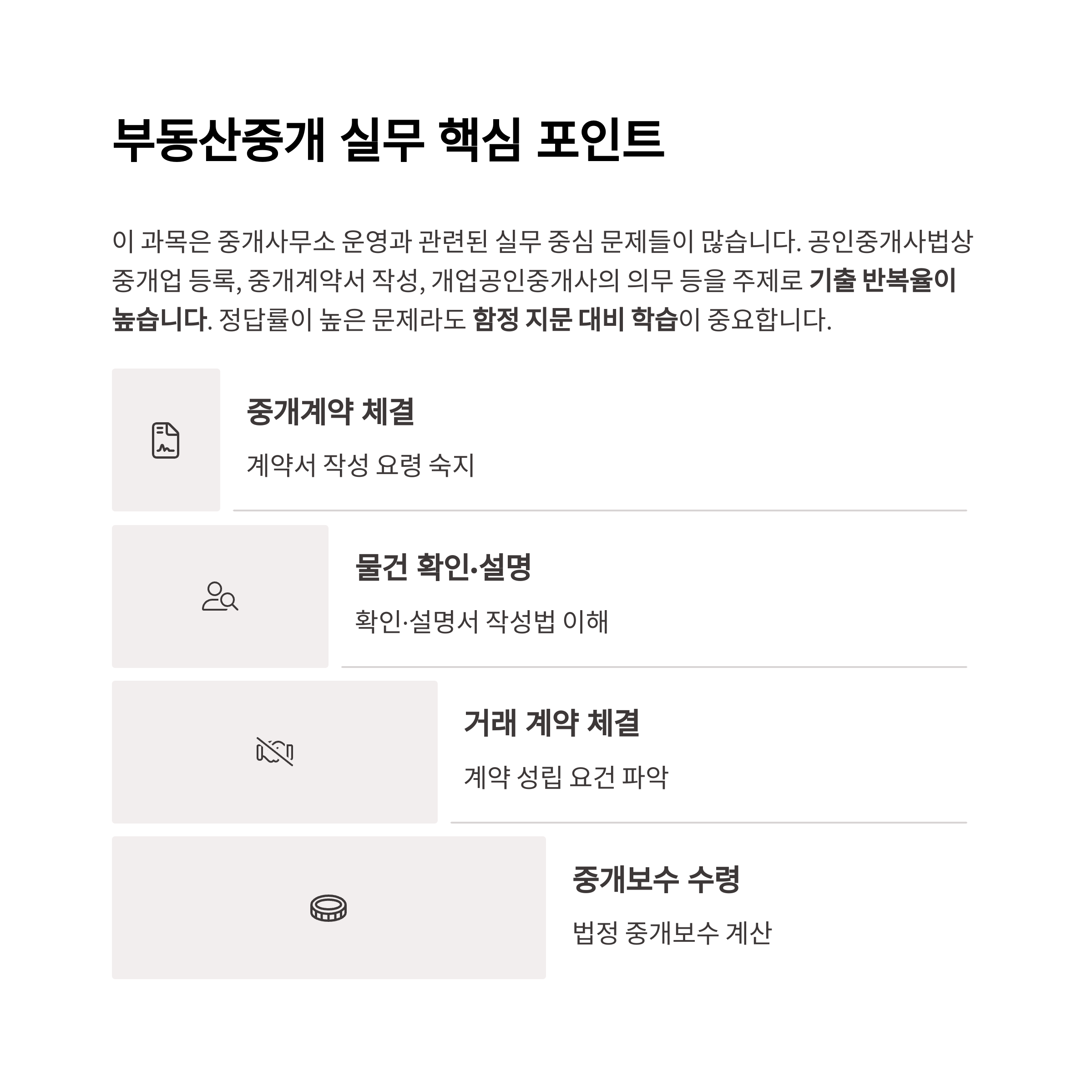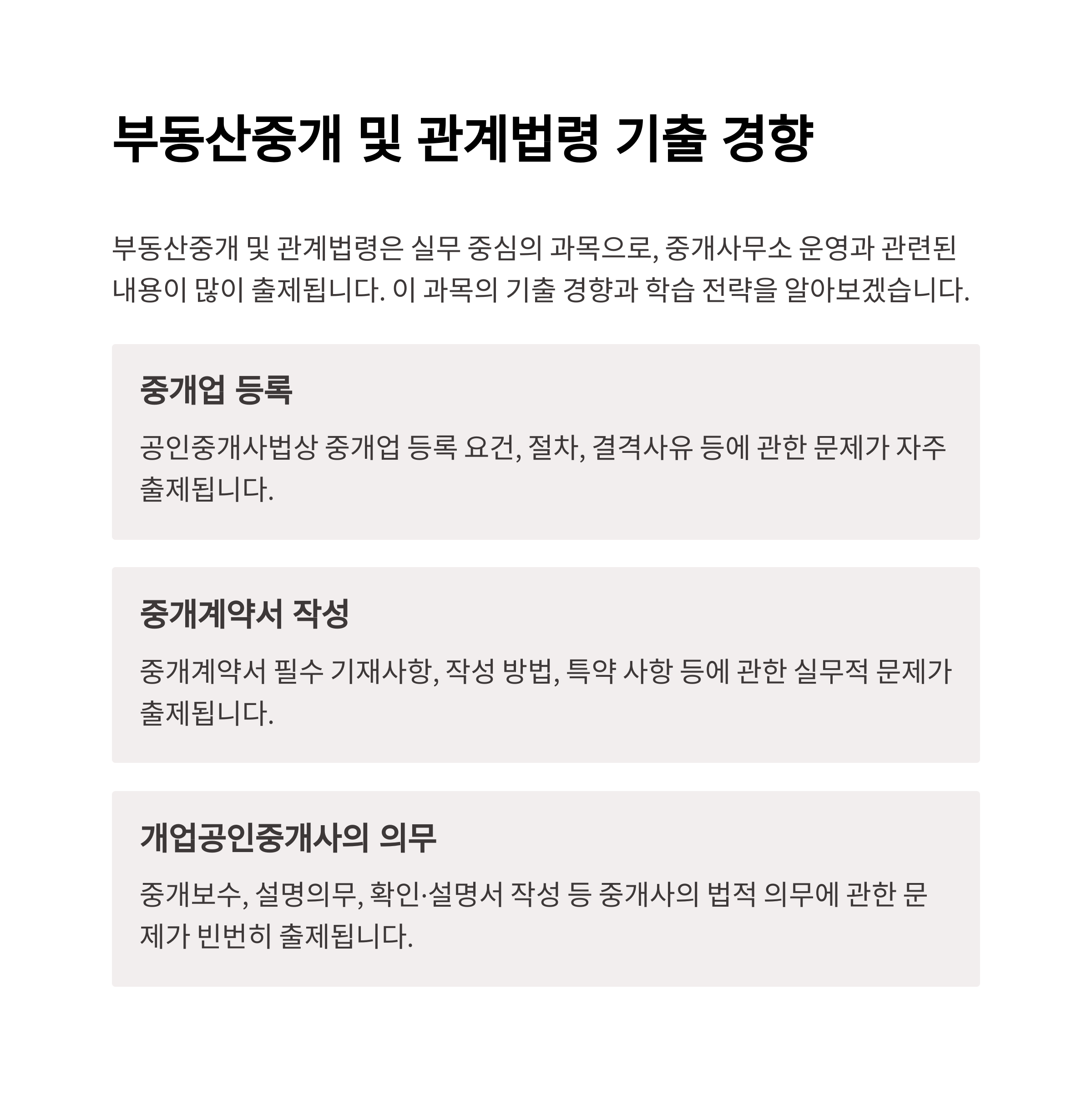 공인중개사법상 중개업 등록, 중개계약서 작성, 개업공인중개사의 의무 등을 주제로 기출 반복율이 높습니다.