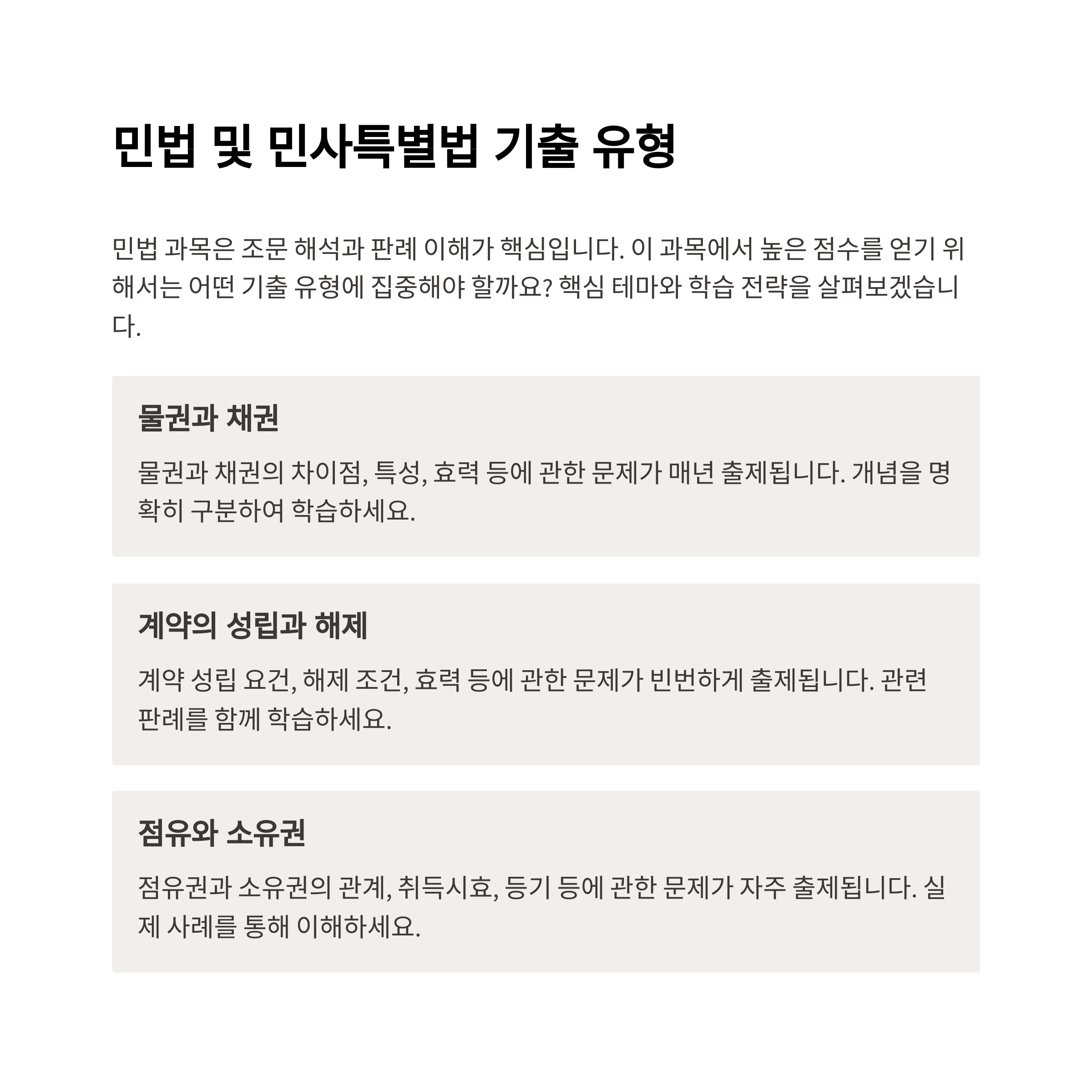 "물권과 채권", "계약의 성립과 해제", "점유와 소유권 관계" 등은 매해 반복되는 핵심 테마입니다.