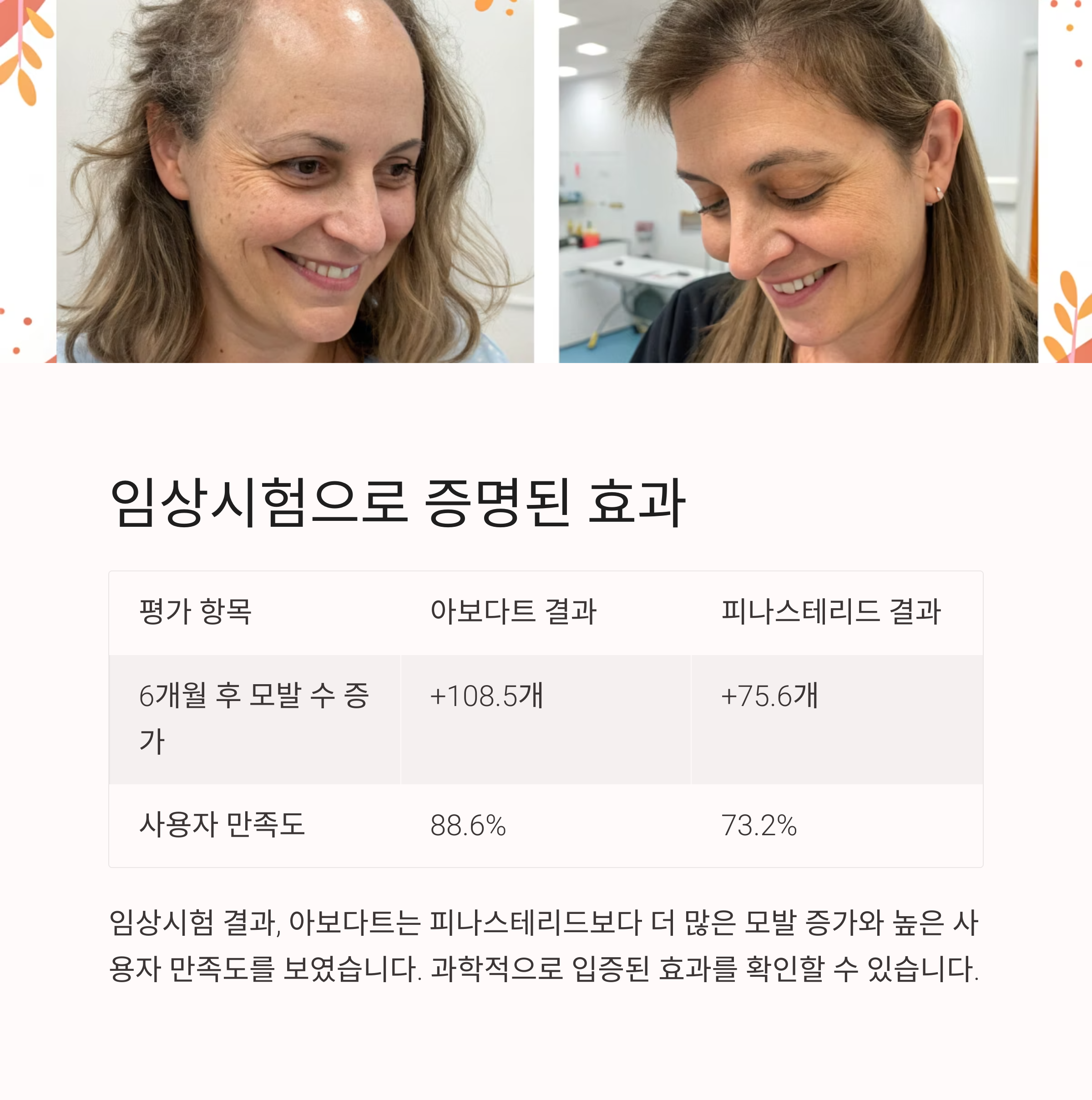 | 6개월 후 모발 수 증가 | +108.5개 | 피나스테리드: +75.6개 |