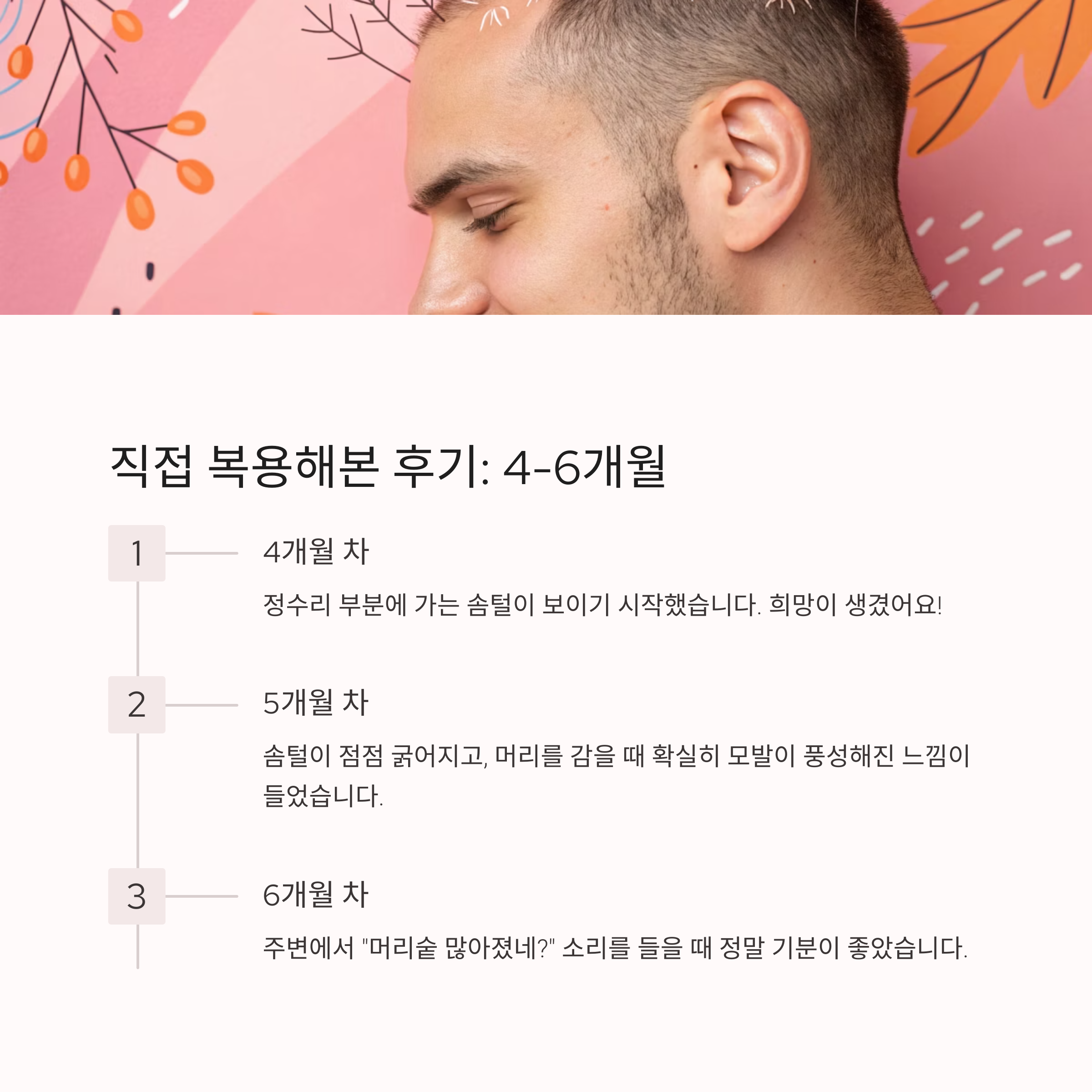 솔직히 말하면 처음에는 반신반의했어요. 하루 한 알로 머리숱이 늘어난다고? 반년 정도 꾸준히 복용하면서 변화가 느껴졌어요. 아래는 제가 체감한 변화 포인트입니다.