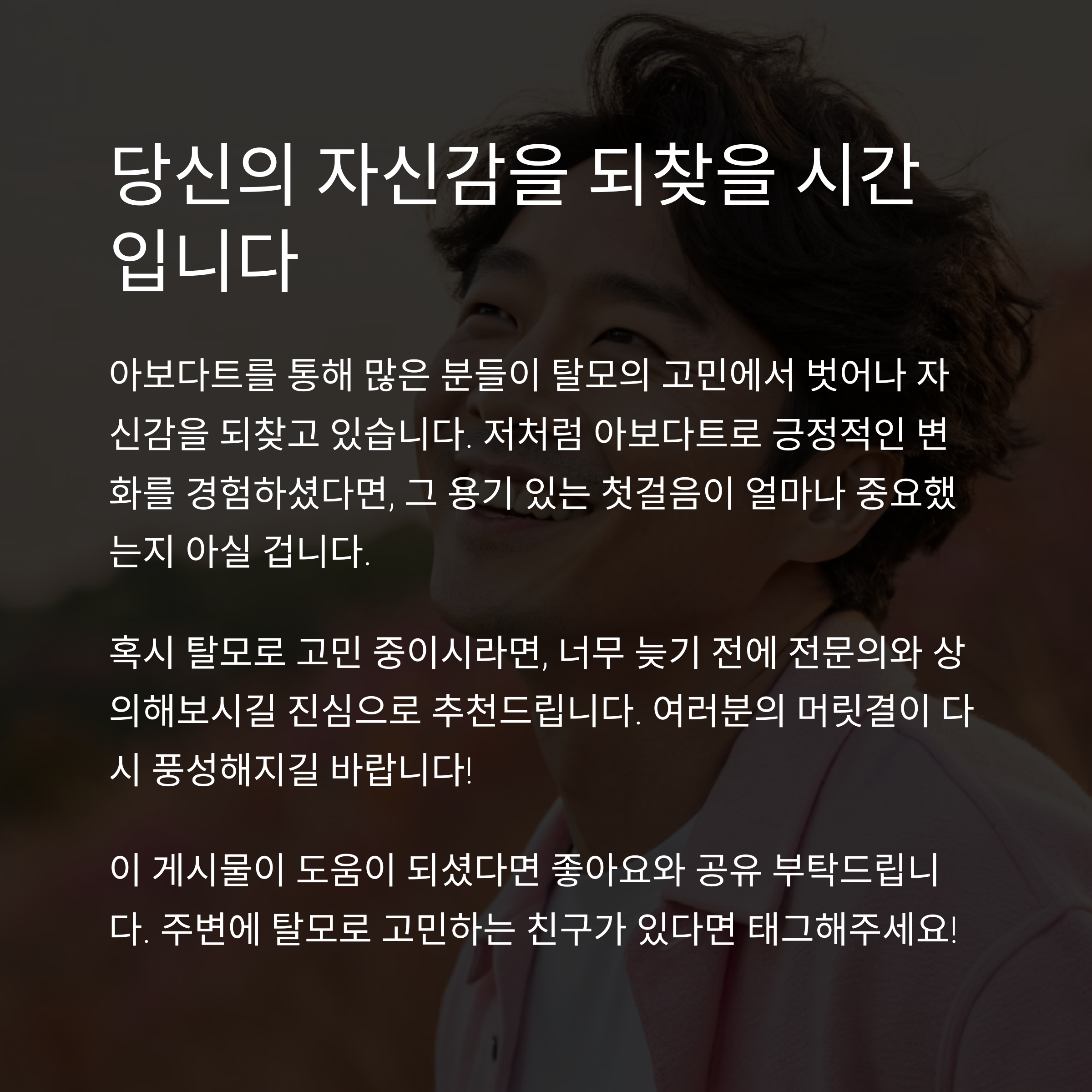 여러분, 탈모는 단순히 머리카락만의 문제가 아니에요. 자존감, 자신감, 심지어 대인관계까지 영향을 주죠. 저처럼 아보다트를 통해 긍정적인 변화를 경험해보셨다면, 그 용기 있는 첫걸음이 얼마나 중요한지 아실 거예요. 혹시 고민 중이시라면, 너무 늦기 전에 전문의와 상의해보시길 진심으로 추천드립니다. 여러분의 머릿결이 다시 풍성해지길 바랄게요!