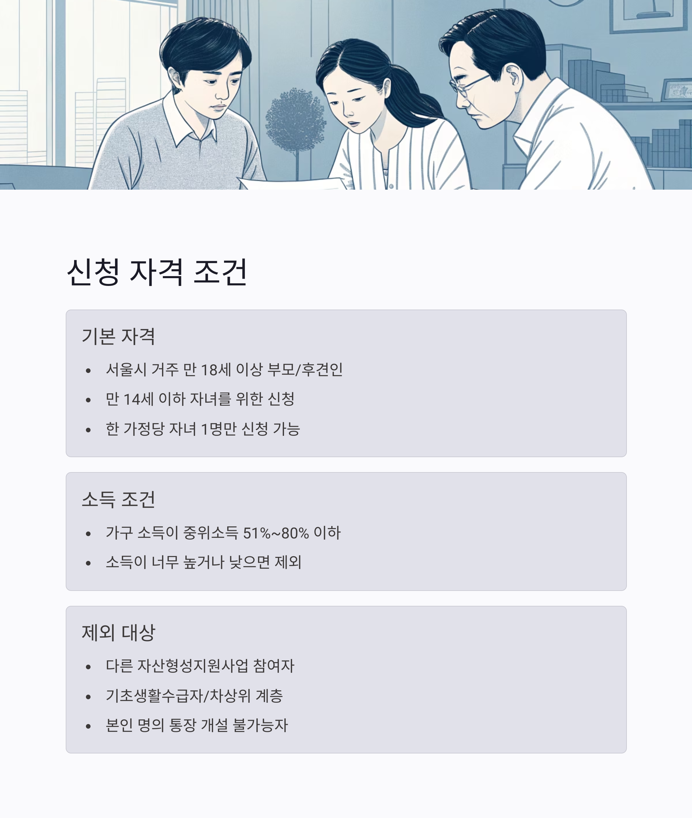 서울시에 거주하는 만 18세 이상 부모 또는 후견인이며, 만 14세 이하 자녀를 둔 가정에서 신청 가능합니다. 단, 자녀 1명당 1계좌만 신청할 수 있어요.