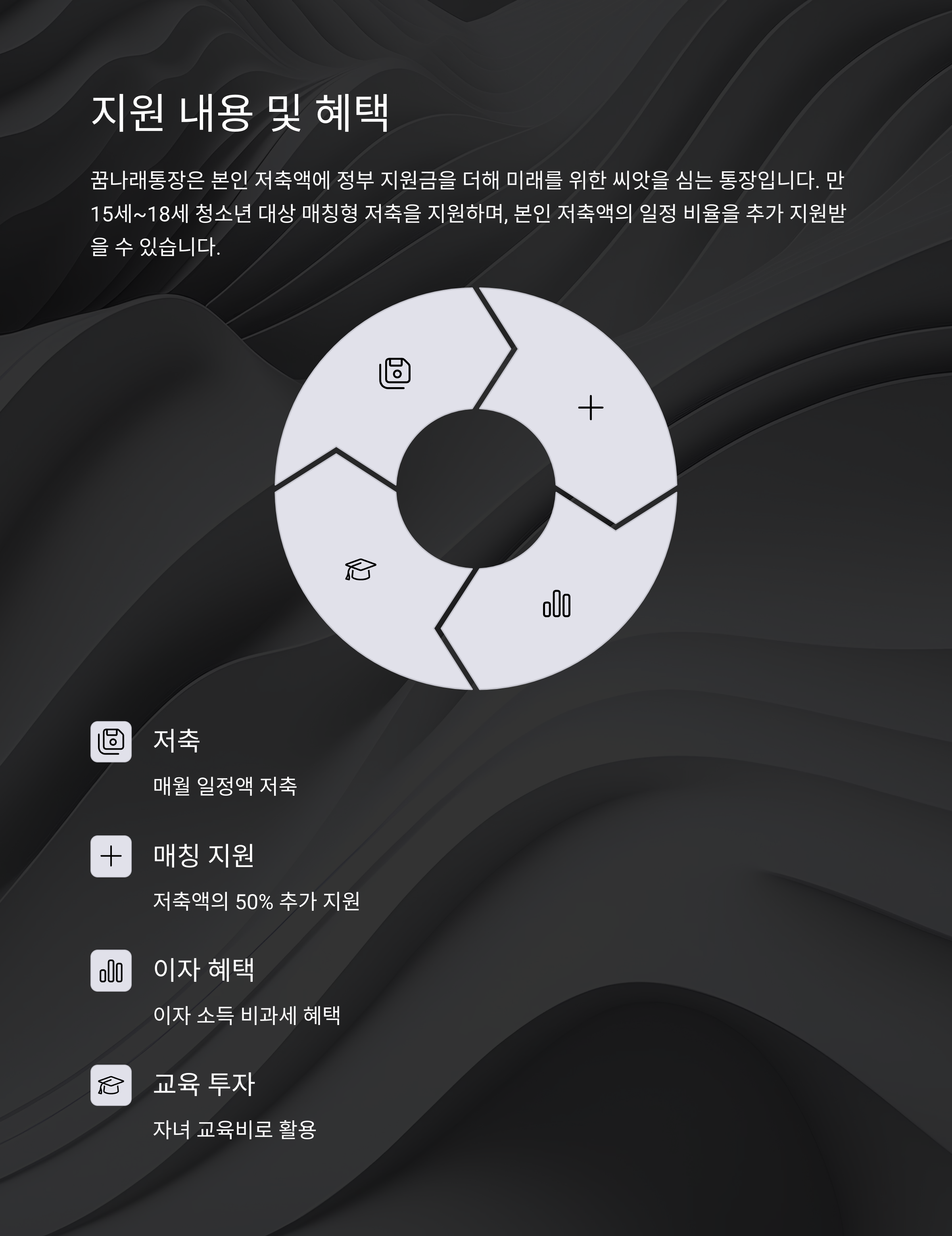 저축 습관을 통해 경제적 자립 능력을 기르고, 만기 시 원금 + 지원금 + 이자까지 수령할 수 있어요.