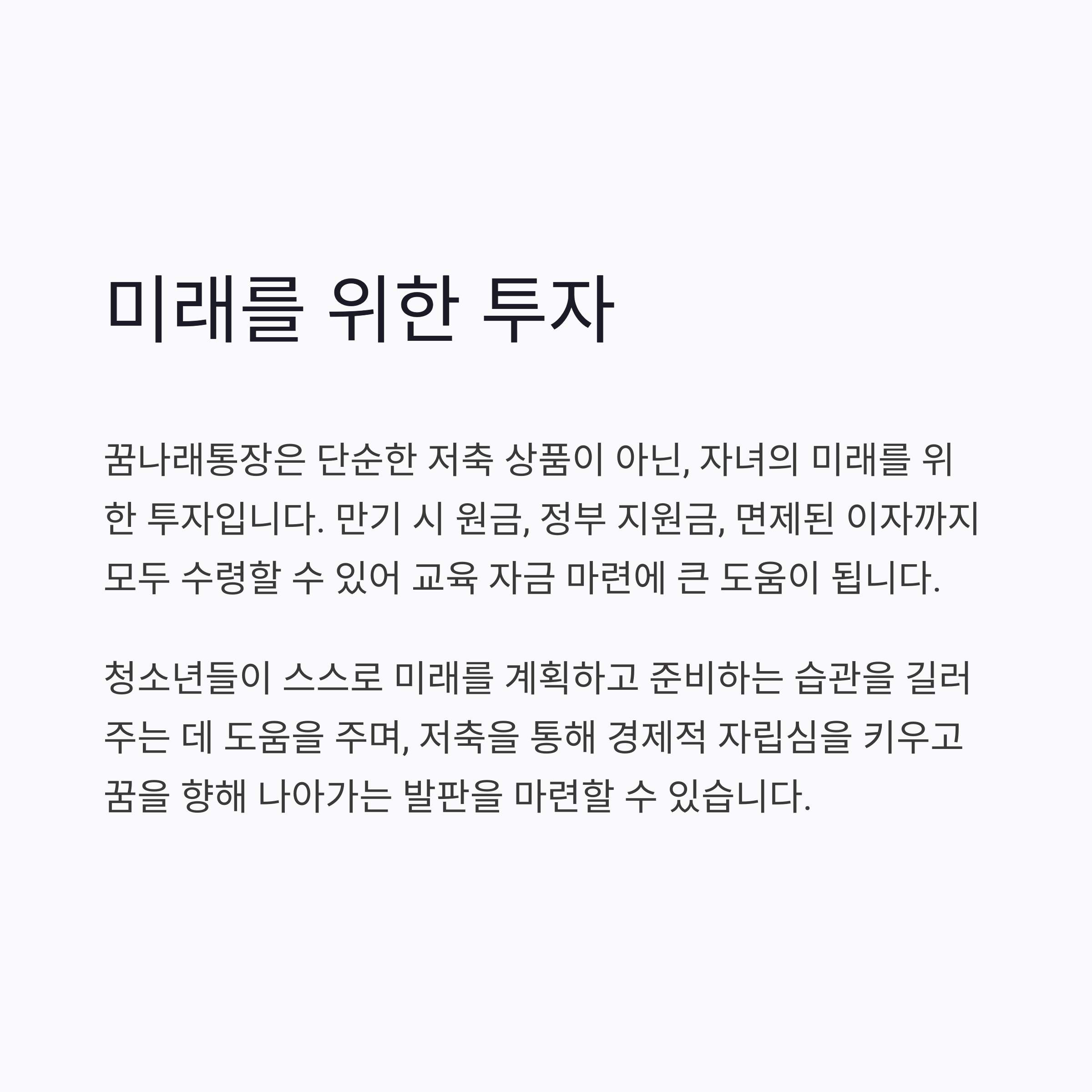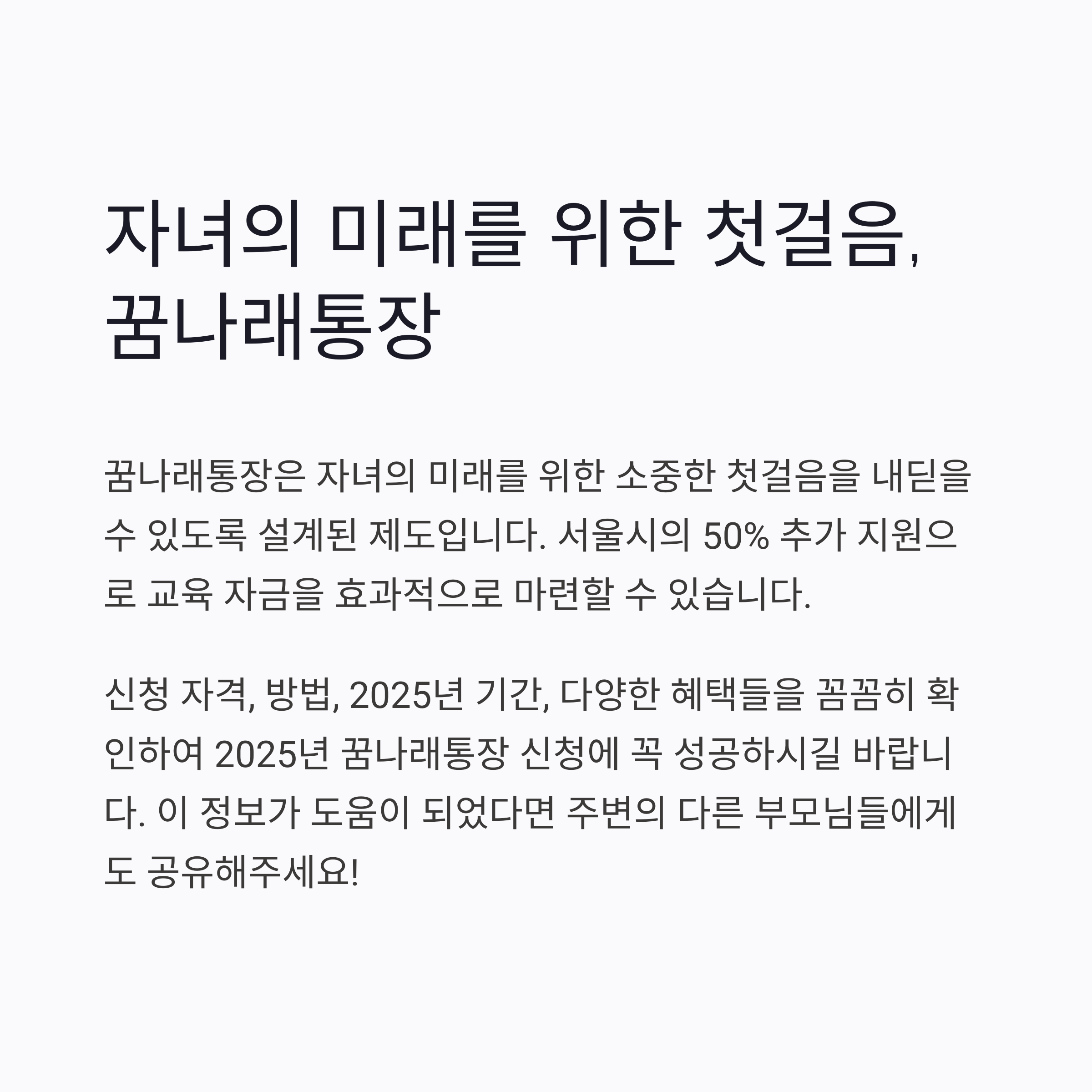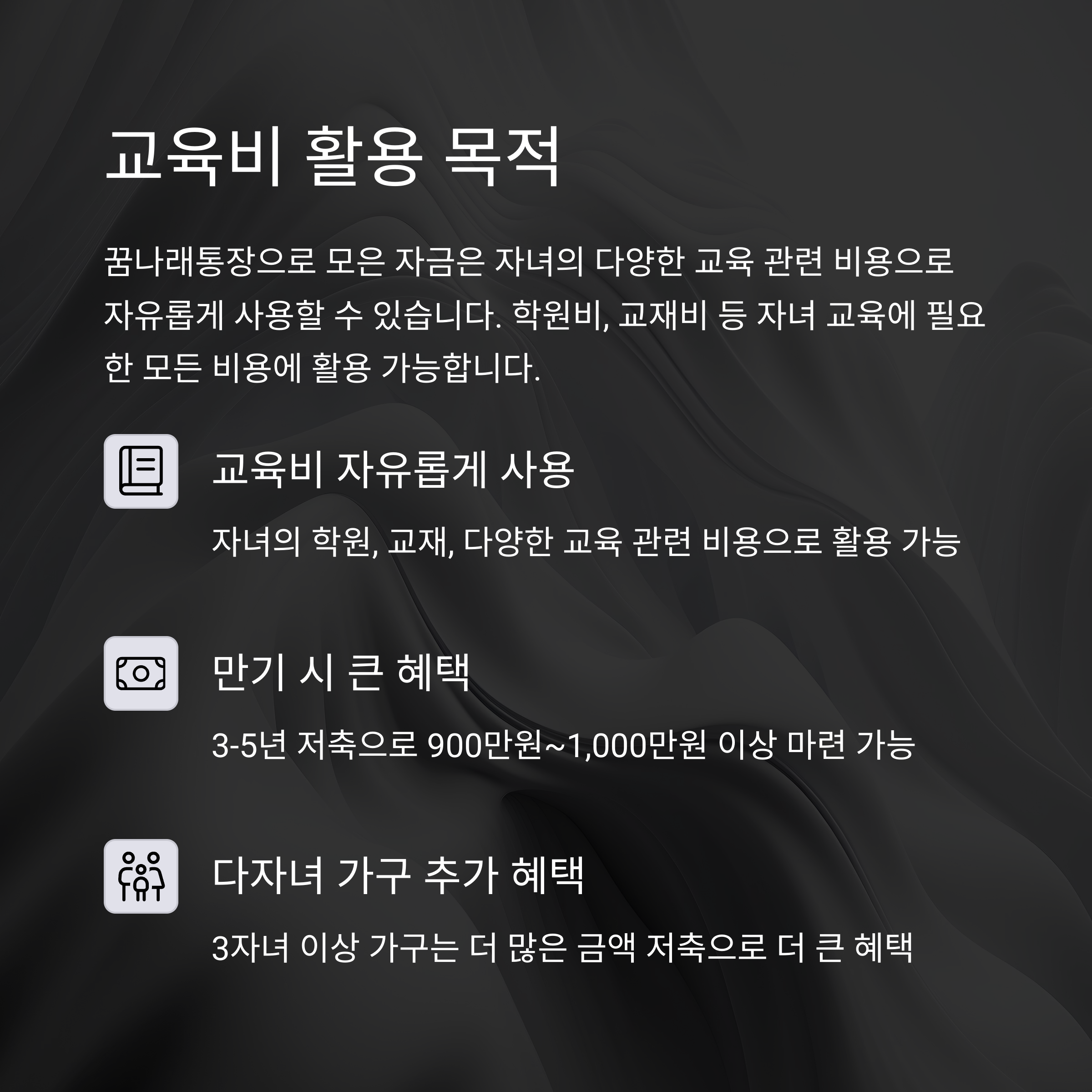 꿈나래통장은 자녀의 교육을 위한 소중한 투자입니다. 지금 조건을 확인하고 2025년 신청 기간을 절대 놓치지 마세요!