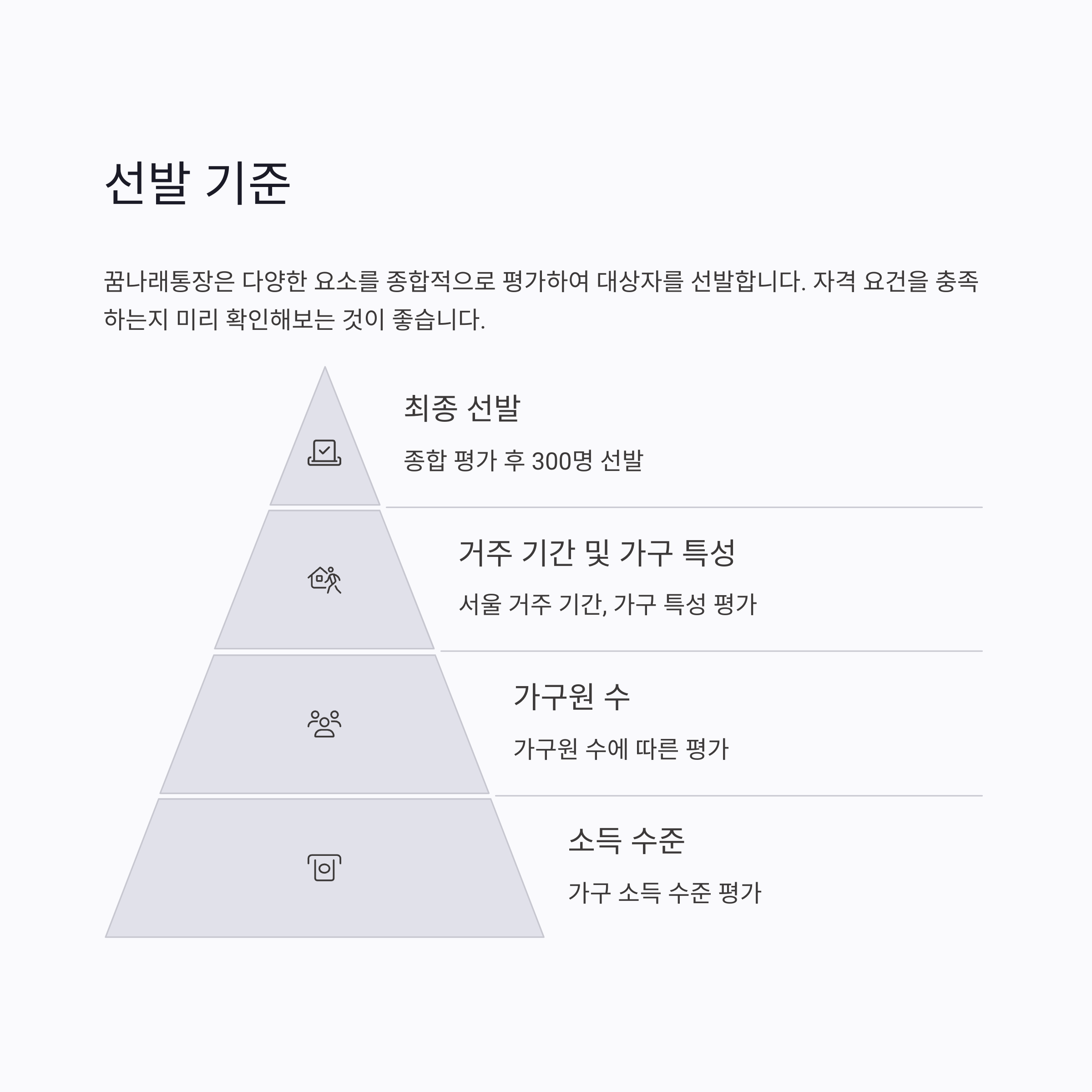 소득 수준, 서울 거주 기간, 가구원 수, 가구 특성 등 종합 평가 후 선발합니다.