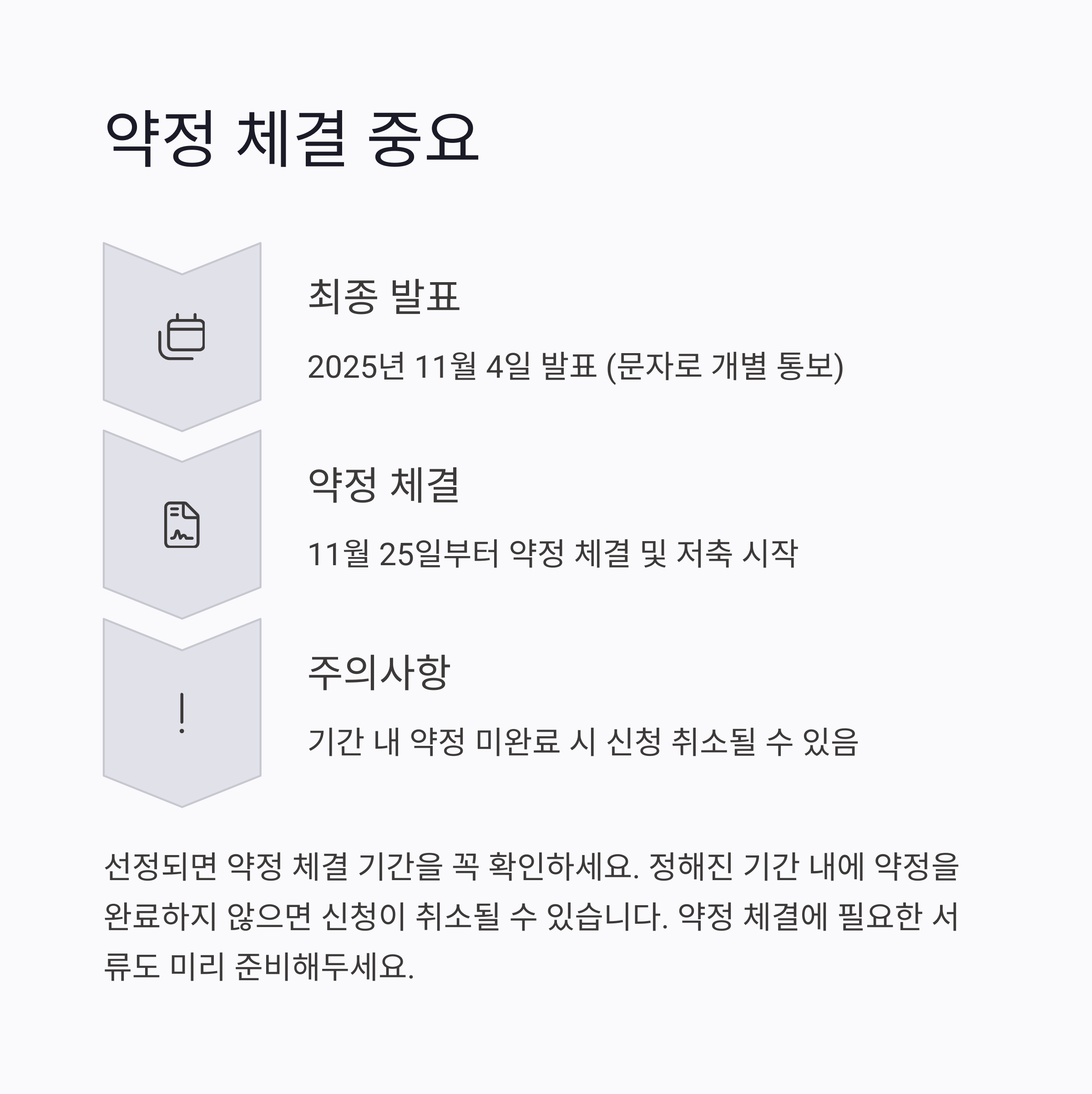 선정 시 11월 25일부터 약정 체결이 시작되며, 기한 내 미체결 시 선정이 취소될 수 있어요.