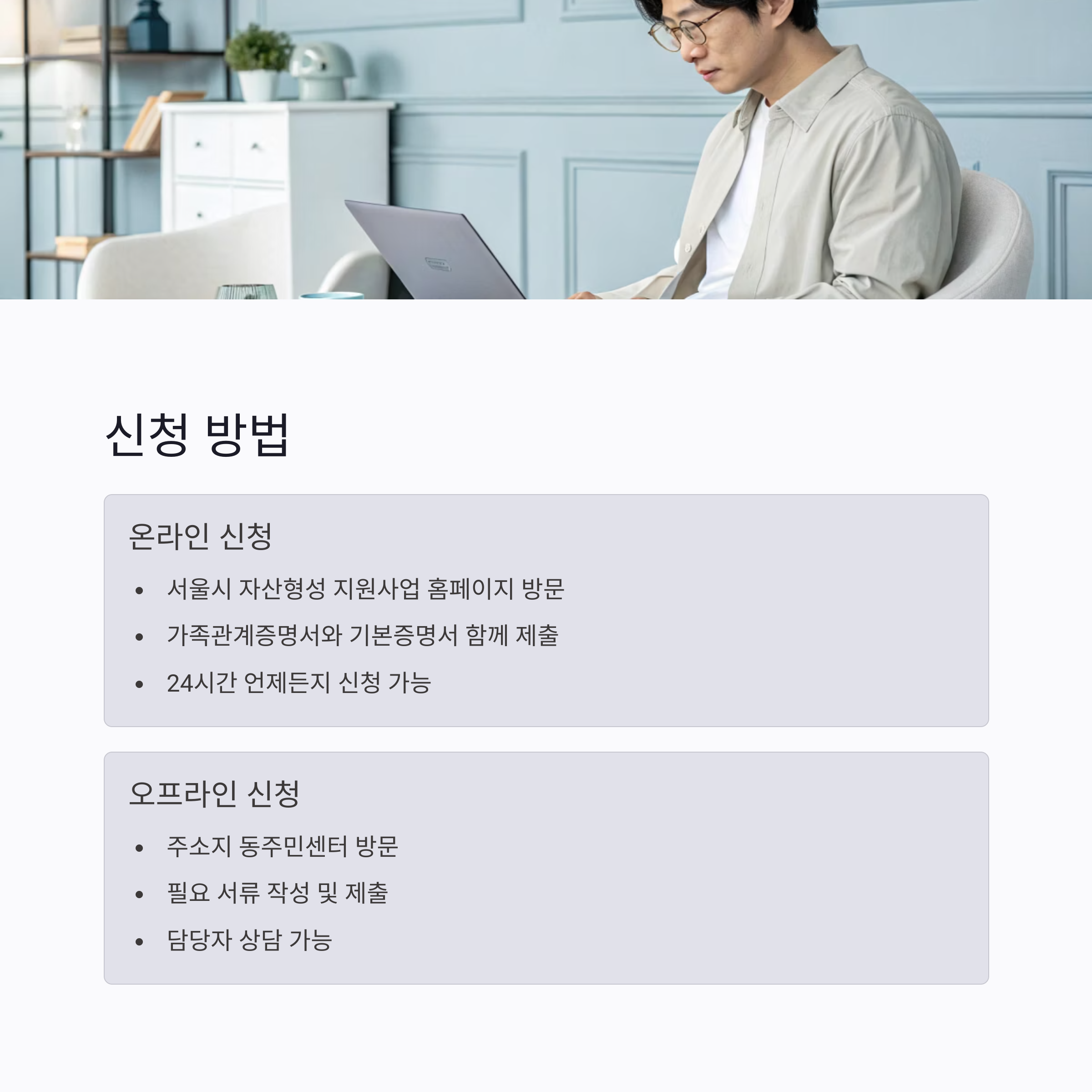 신청은 온라인 또는 동주민센터 방문을 통해 가능합니다. 신청 전 준비 서류를 미리 확인해두면 빠르게 진행할 수 있어요.