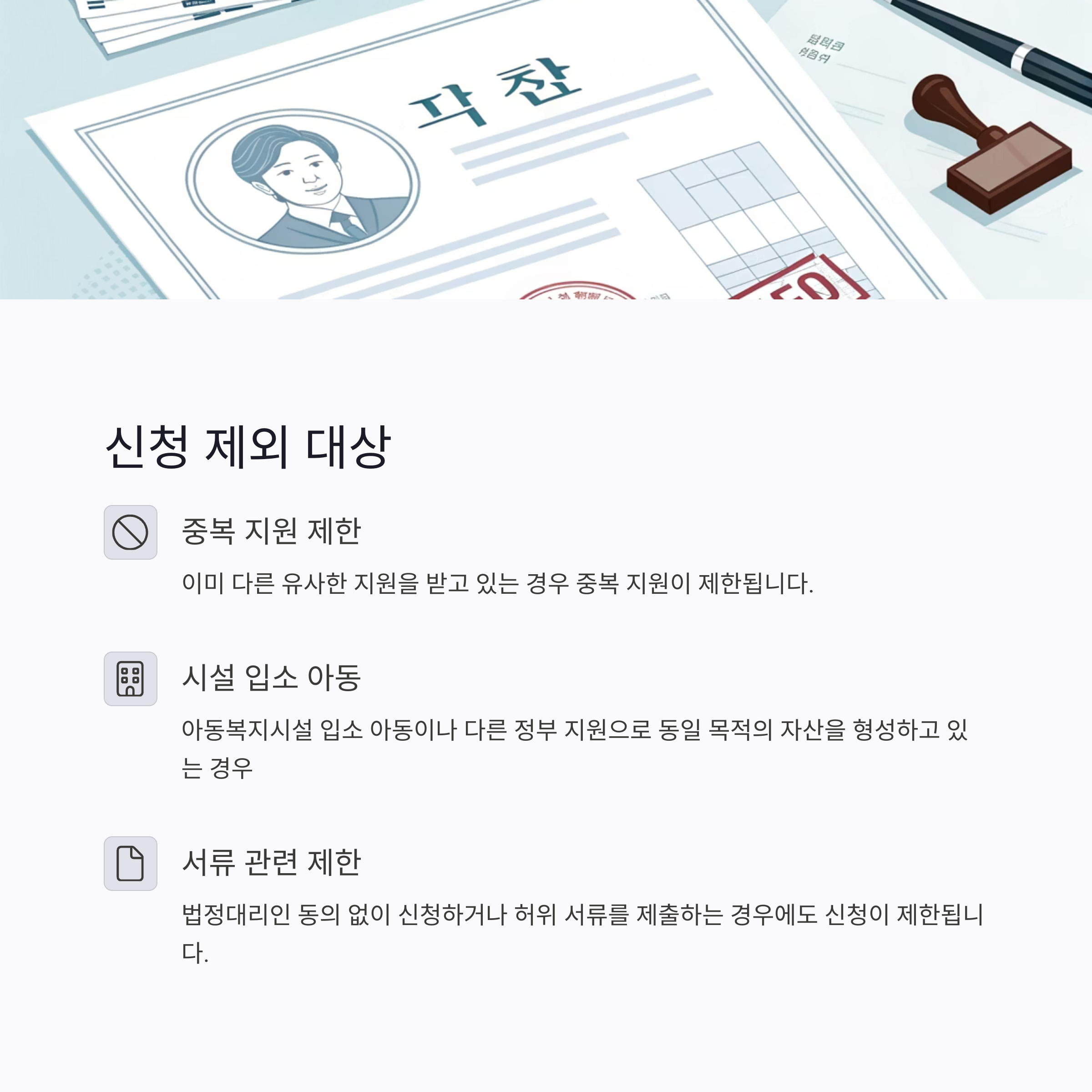 아동복지시설 입소자, 기존 동일 목적 정부 지원 대상자, 허위 서류 제출자, 법정대리인 동의 미확보 시 신청 불가합니다.