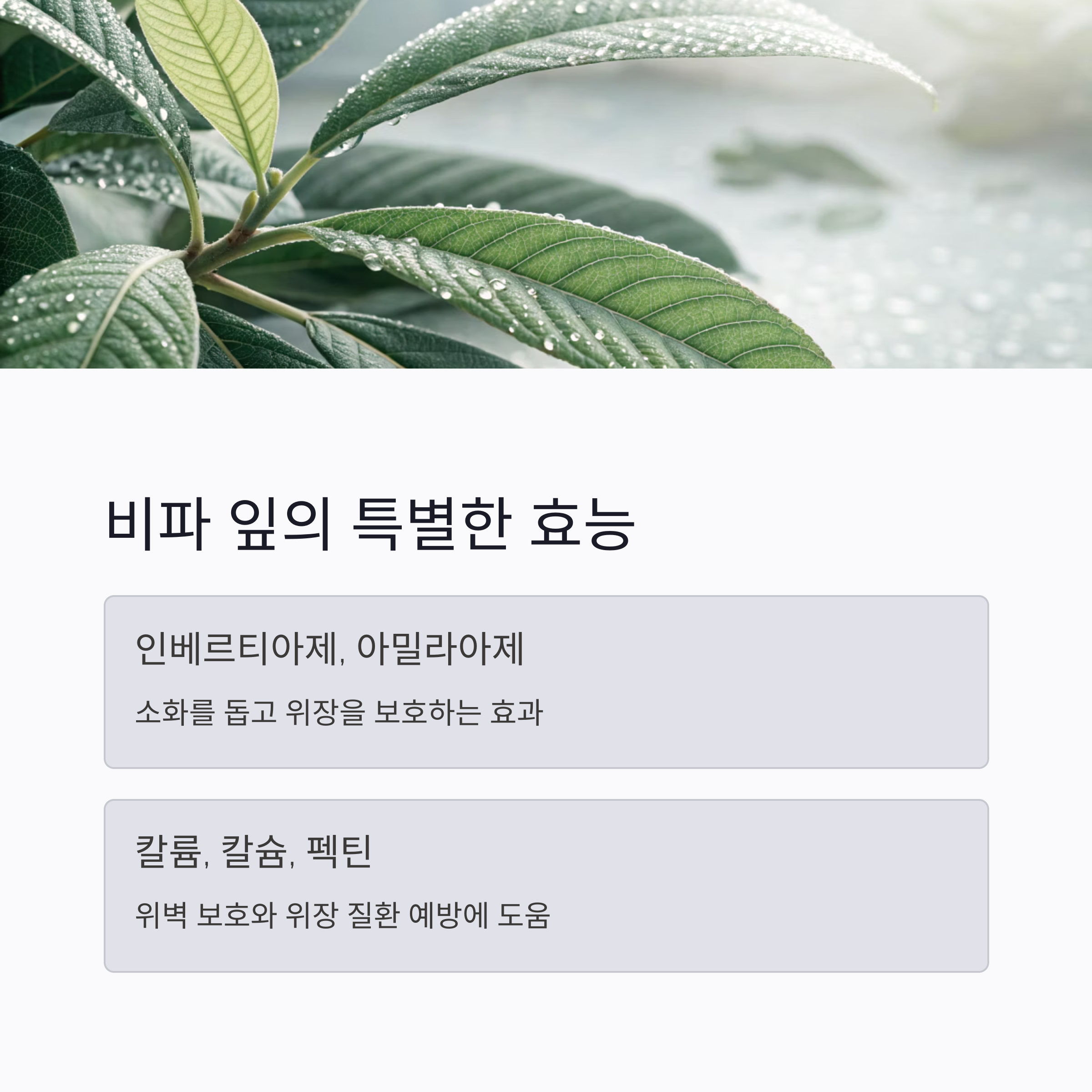 비파 잎은 위장을 보호하고 소화를 돕는 효소들이 포함되어 있어요. 특히 위장 장애가 있는 분들에게 유익해요.