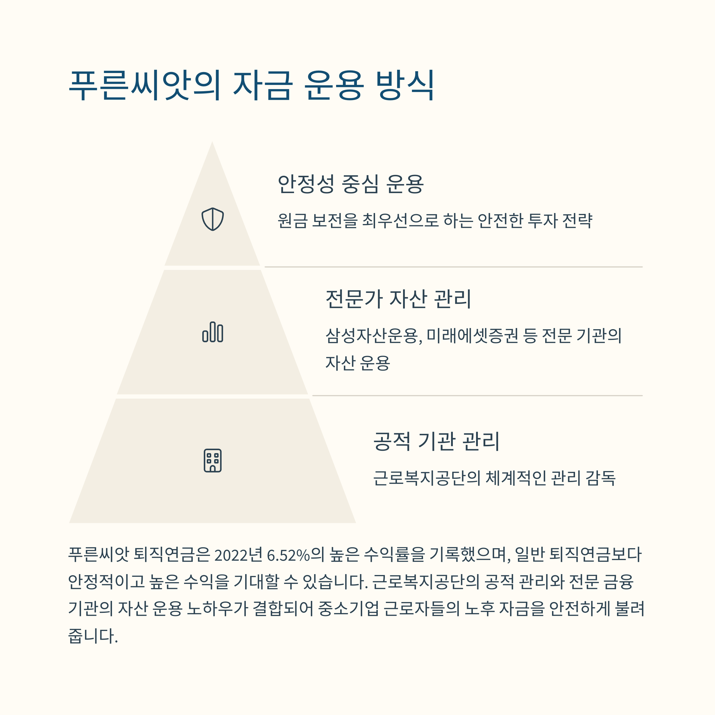 전문기관(삼성자산운용, 미래에셋 등)이 자금을 운용하여 안정성과 투명성을 확보합니다.