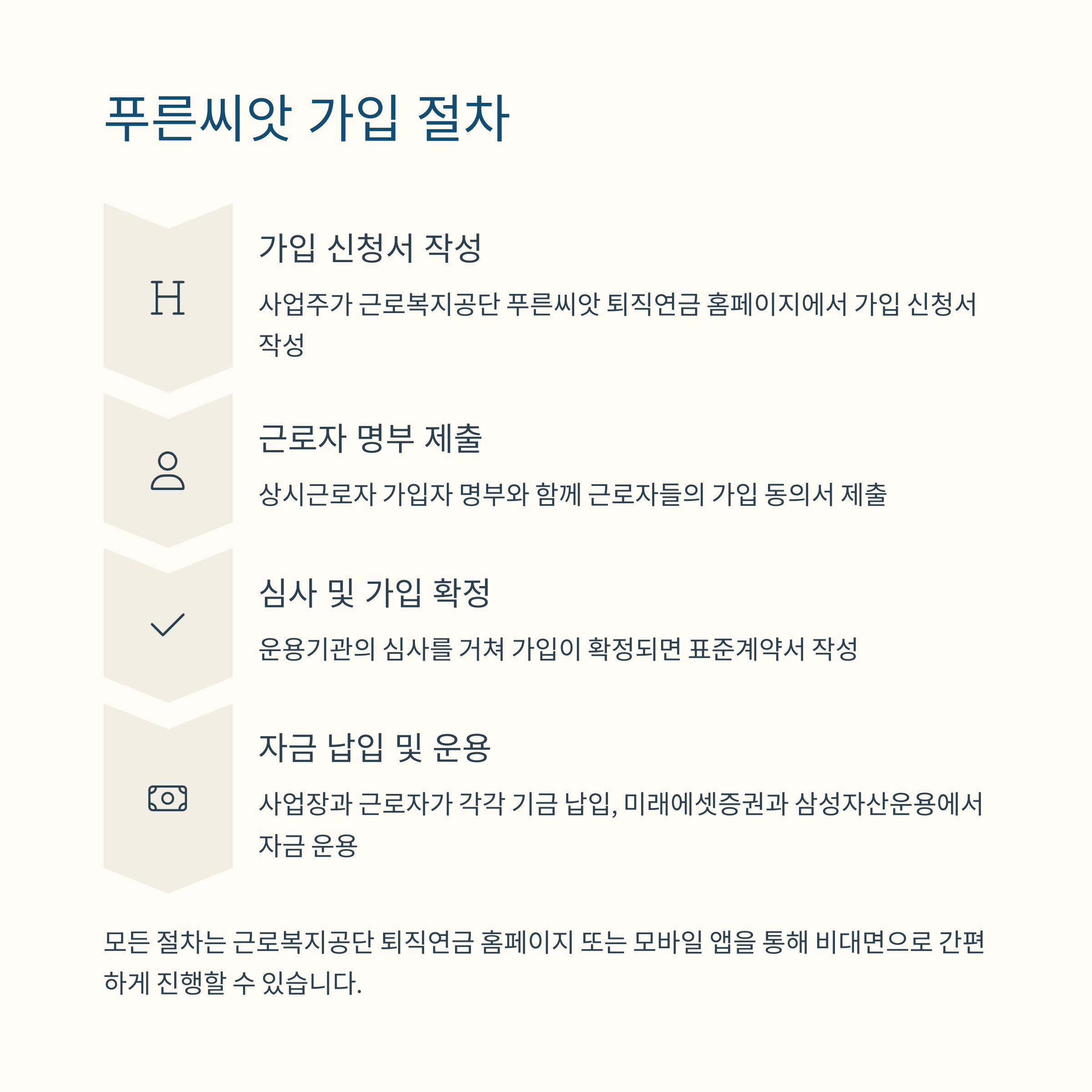 사업주가 공단 홈페이지에서 신청서 작성 → 근로자 동의 후 운용기관 심사 → 가입 확정