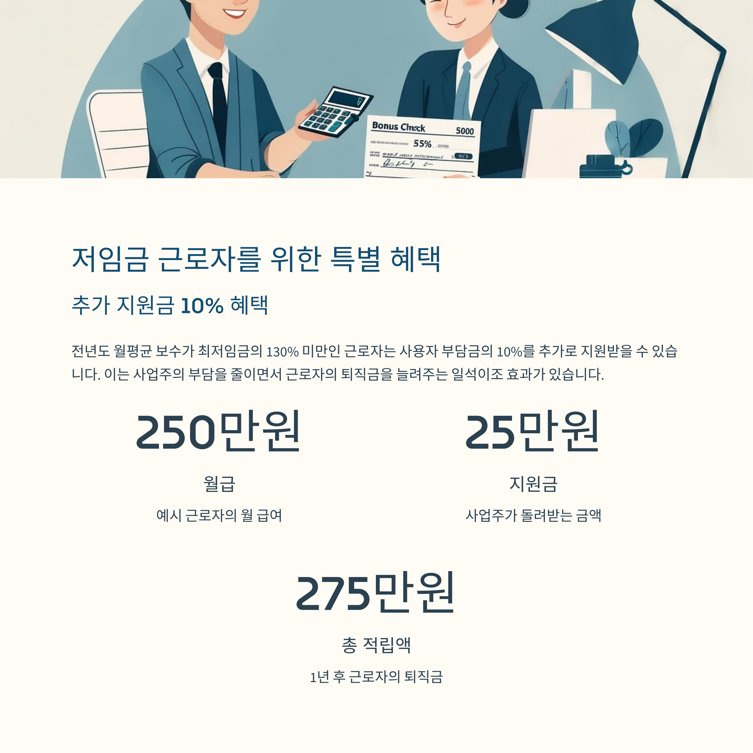 예: 월급 250만원 → 25만원 추가 적립으로 총 275만원 퇴직금 수령 가능