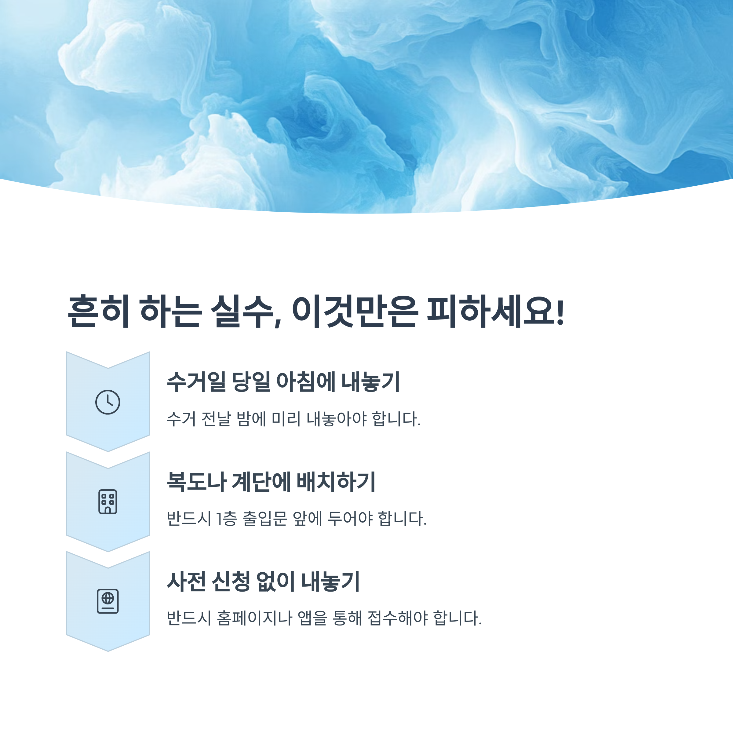- 수거일 아침에 물건 내놓기 → 전날 밤에 꼭 미리 배치!