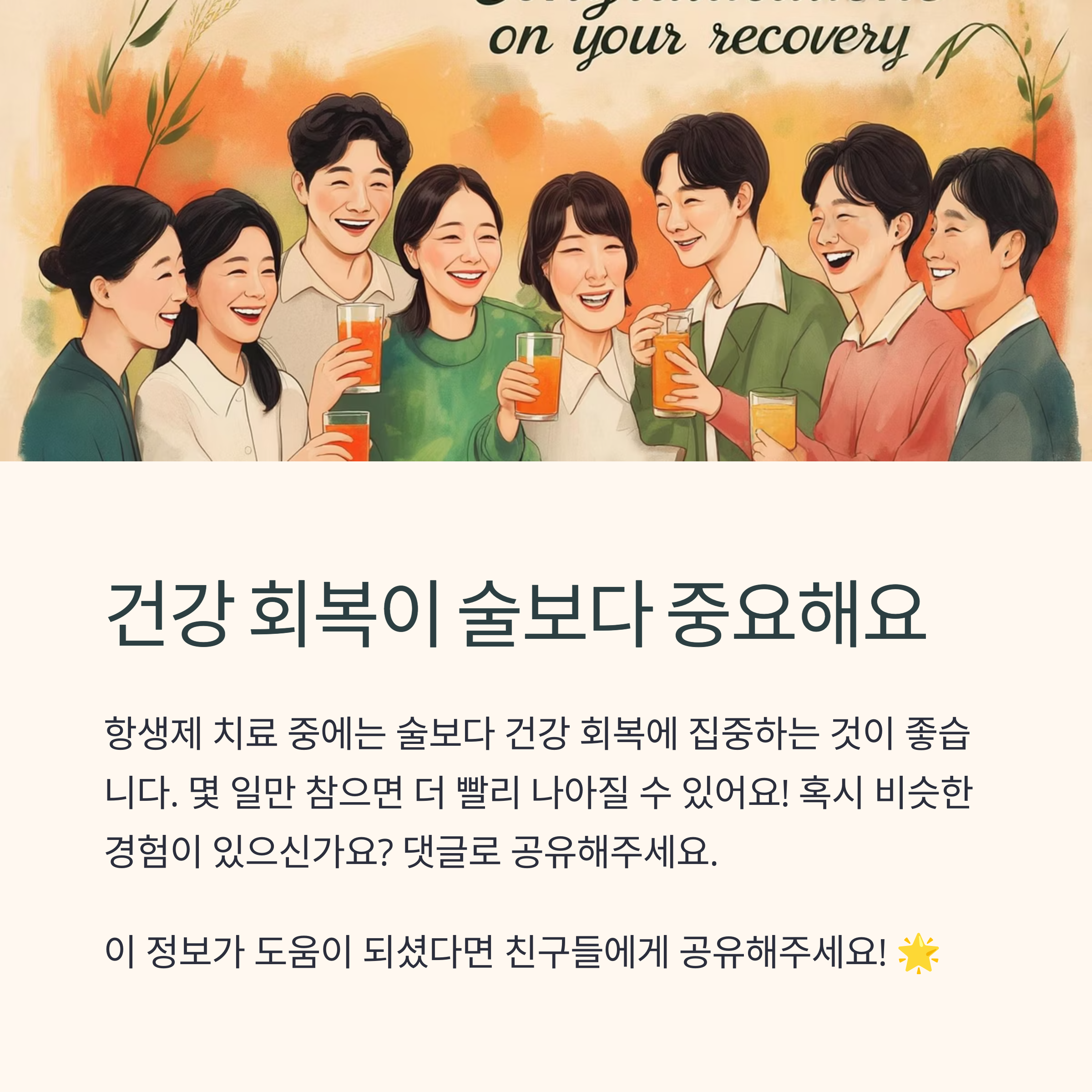 읽어주셔서 정말 감사드려요! 😊 사실 약 먹으면서 술 마셔도 되냐는 질문, 다들 한 번쯤 해보셨을 거예요. 오늘 포스트가 여러분의 궁금증을 조금이나마 풀어드렸다면 정말 뿌듯하네요. 몸이 아플 땐, 잠깐의 유혹보다 회복이 먼저니까요. 여러분도 혹시 같은 상황이라면 잠깐 참고, 건강 회복에 집중해보시는 건 어떨까요? 그리고 혹시 경험 있으신 분들, 댓글로 공유해주시면 정말 좋겠어요! 우리끼리 정보 공유하면서 더 건강해지자구요 💚