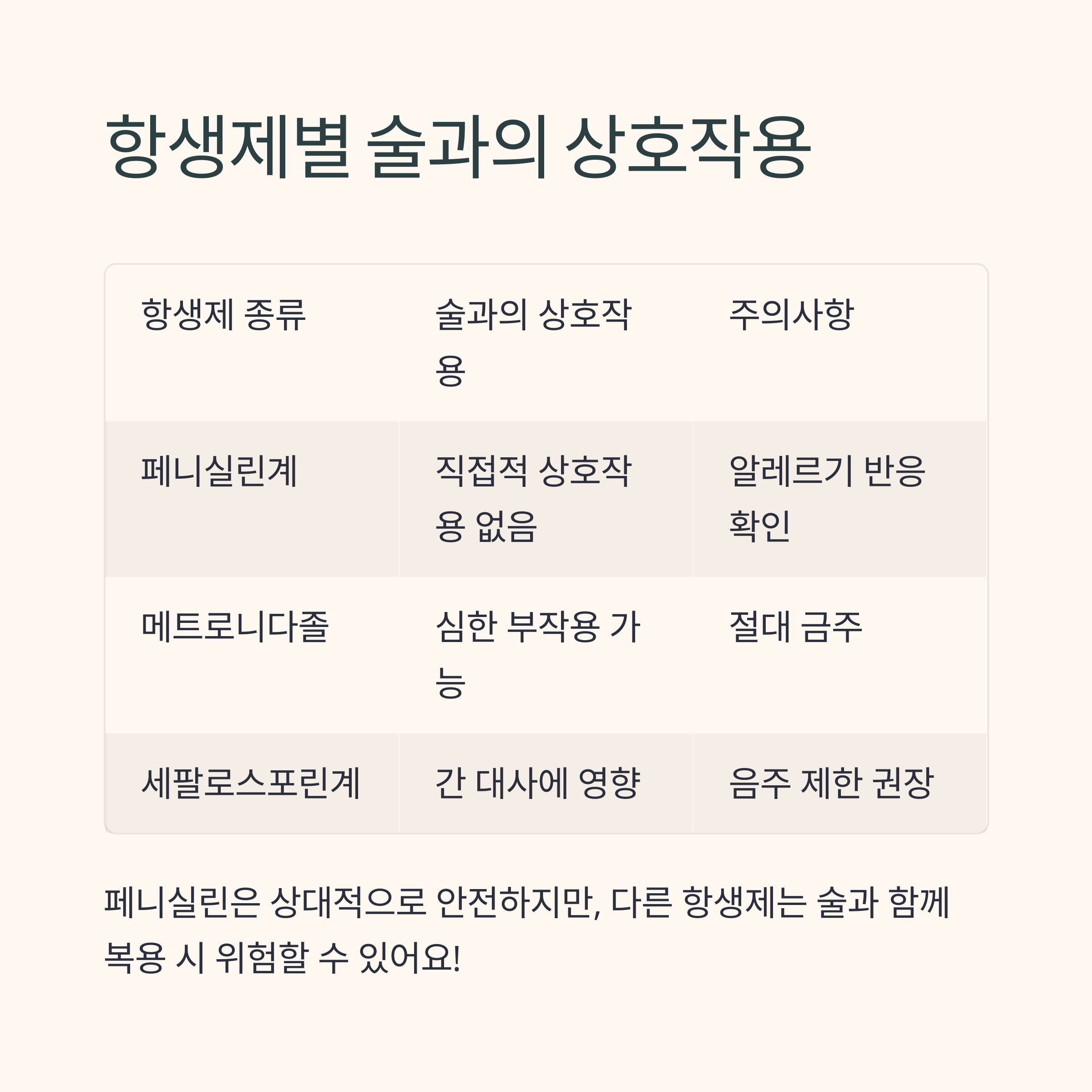 | 항생제 종류 | 술과의 상호작용 | 주의사항 |