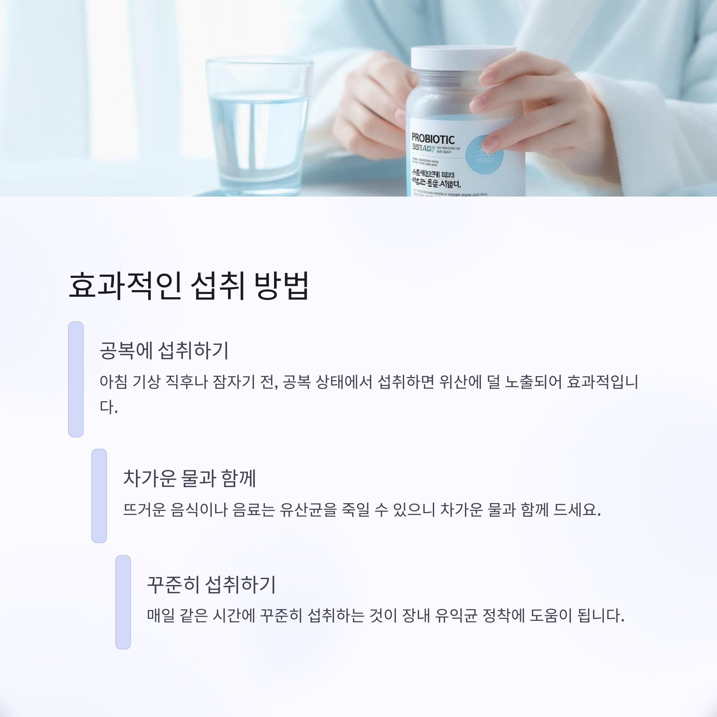 프로바이오틱스를 먹는 ‘타이밍’과 ‘방법’도 정말 중요해요. 공복 상태에서 섭취해야 유산균이 위산에 덜 노출돼 장까지 잘 도달할 수 있거든요. 그리고 뜨거운 음식이나 음료와 함께 먹으면 유산균이 죽을 수 있기 때문에 되도록 차가운 물과 함께 드세요. 저 같은 경우엔 아침 기상 직후 물 한 잔과 함께 먹는 루틴을 만들었는데요, 그게 제일 편하더라구요. 하루에 정해진 시간에 꾸준히 섭취하는 게 핵심이에요!
