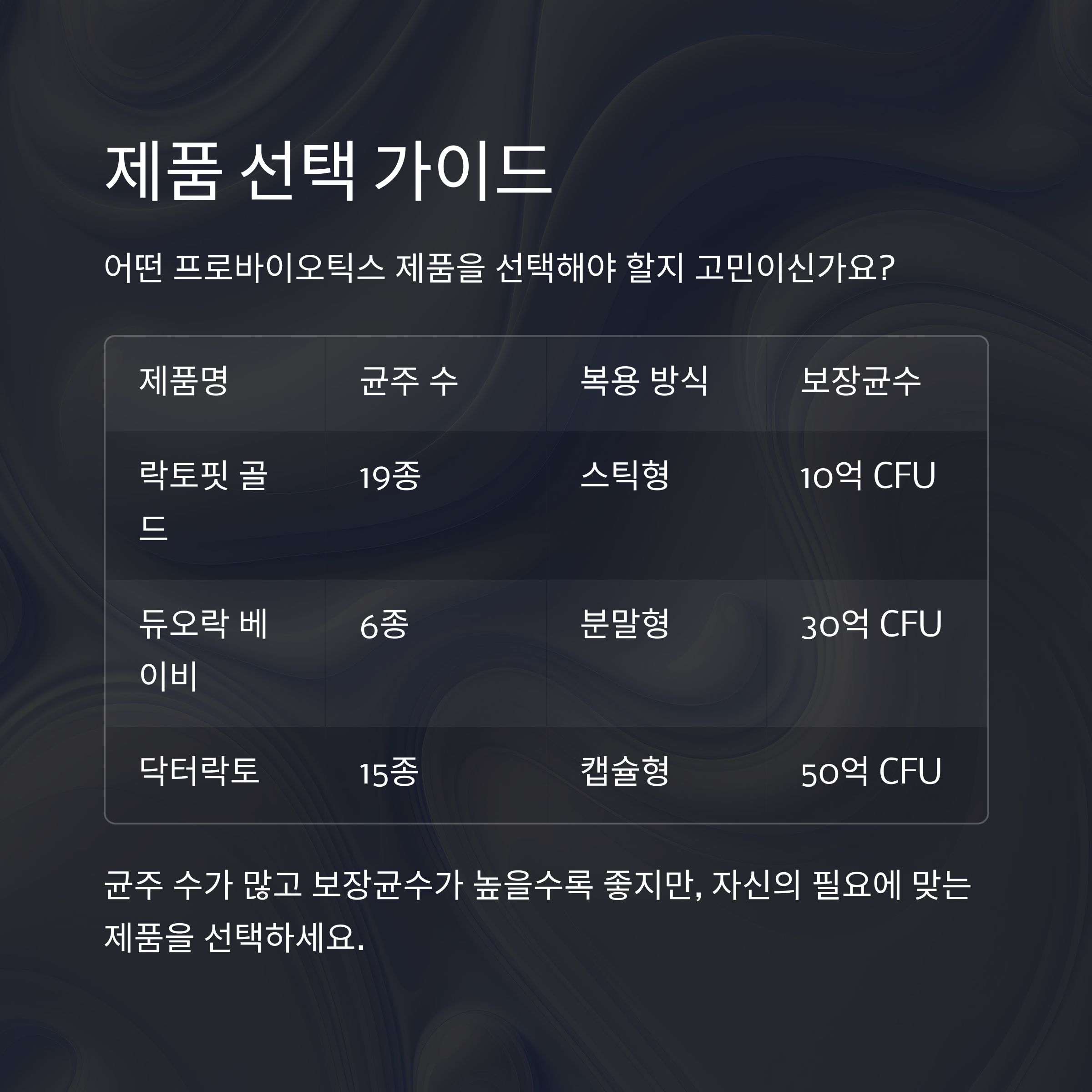 마트나 약국에 가보면 정말 많은 프로바이오틱스 제품들이 있어요. 도대체 어떤 걸 골라야 할지 모르겠을 정도죠. 아래 표는 몇 가지 주요 기준으로 제품을 비교해본 내용이에요.