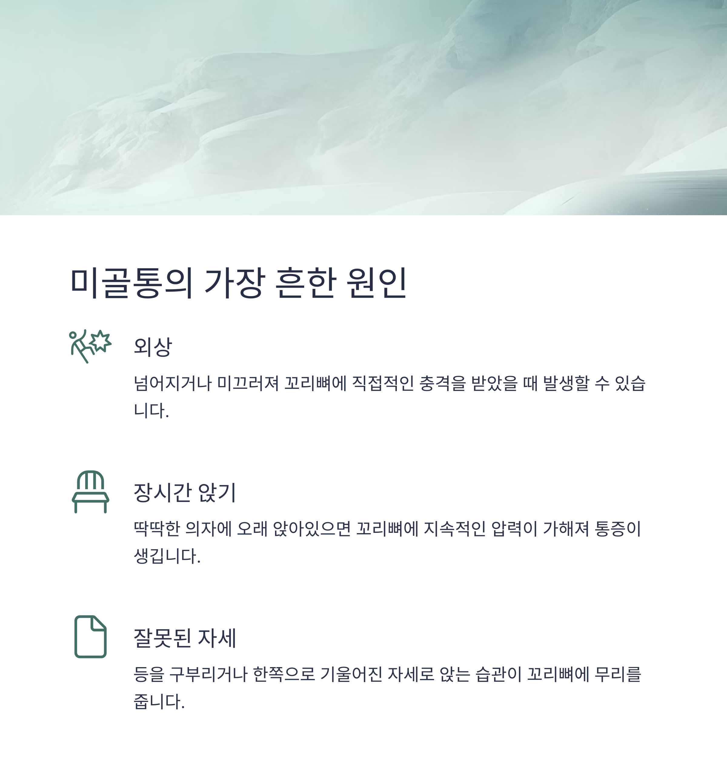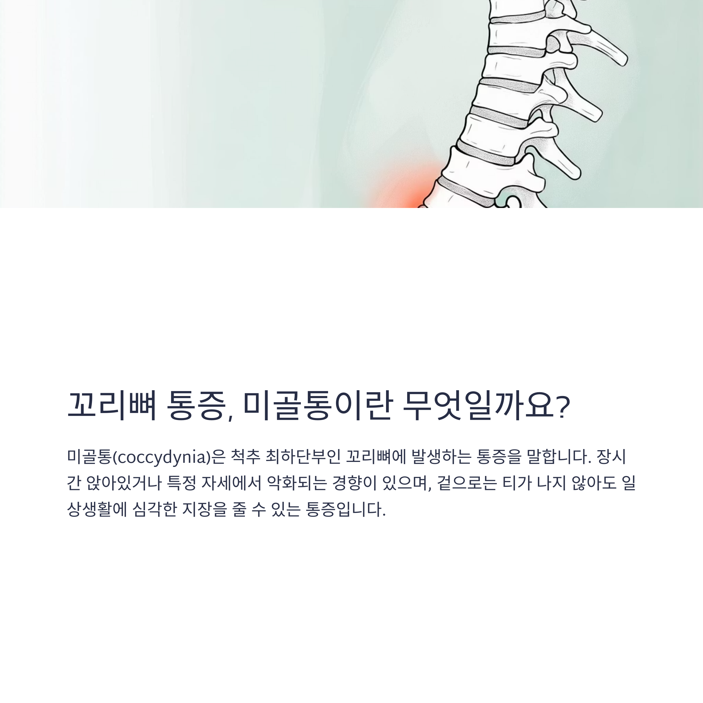 안녕하세요. 최근 앉을 때마다 찌릿하거나 불편함을 느끼는 분 계신가요? 무심코 넘길 수 있는 이 통증, 사실 ‘미골통(꼬리뼈 통증)’일 수 있습니다. 자세 문제부터 외상, 심하면 만성 통증으로 이어질 수도 있는데요. 이번 포스팅에서는 꼬리뼈 통증의 원인, 증상, 대처법까지 자세히 안내해드릴게요. 통증을 줄이고 일상을 편하게 바꾸는 첫걸음, 지금부터 함께 알아보시죠.