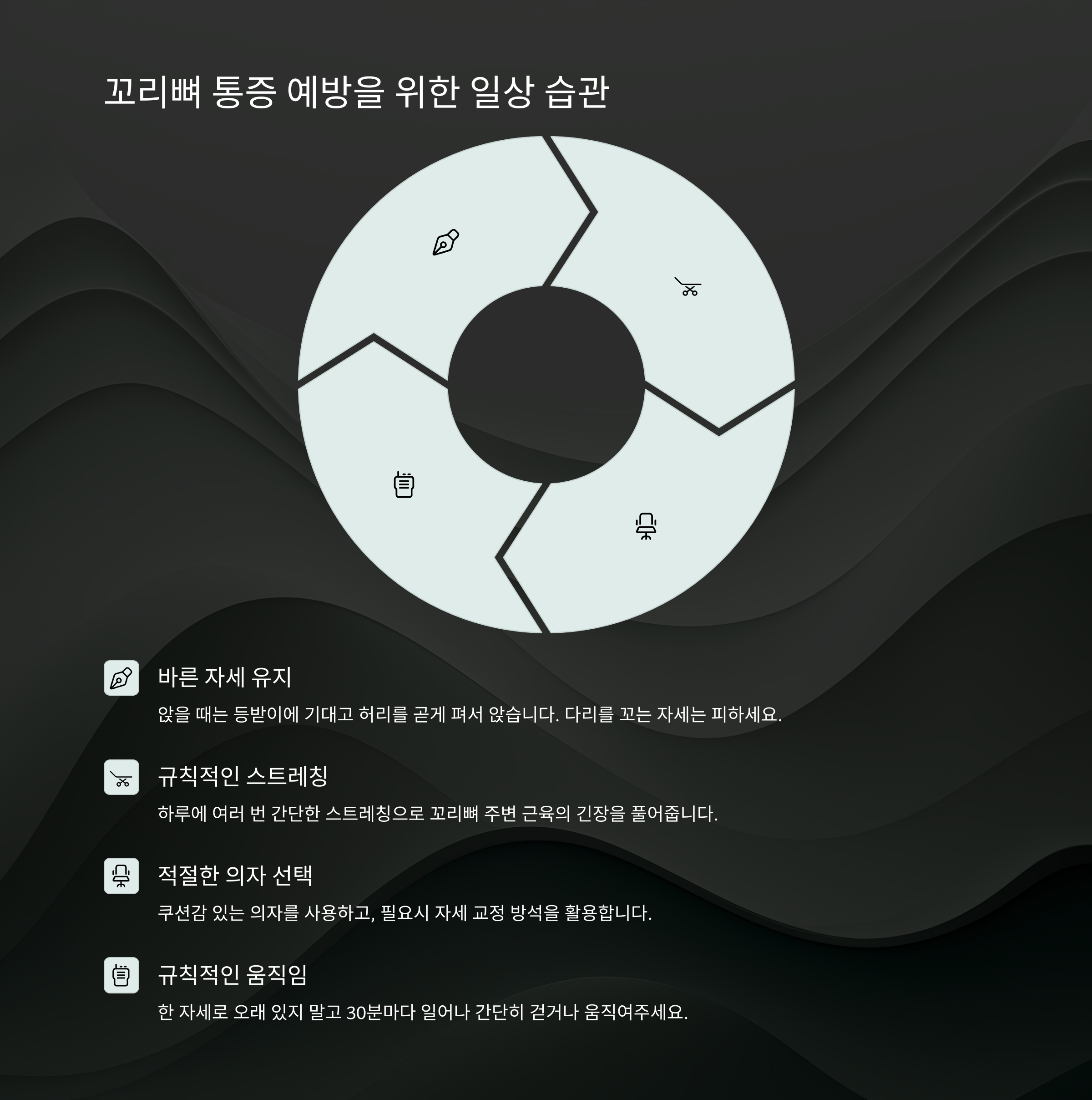 꼬리뼈 통증을 예방하려면 평소 생활 습관이 무엇보다 중요해요. 다음의 예방법을 실천해보세요.