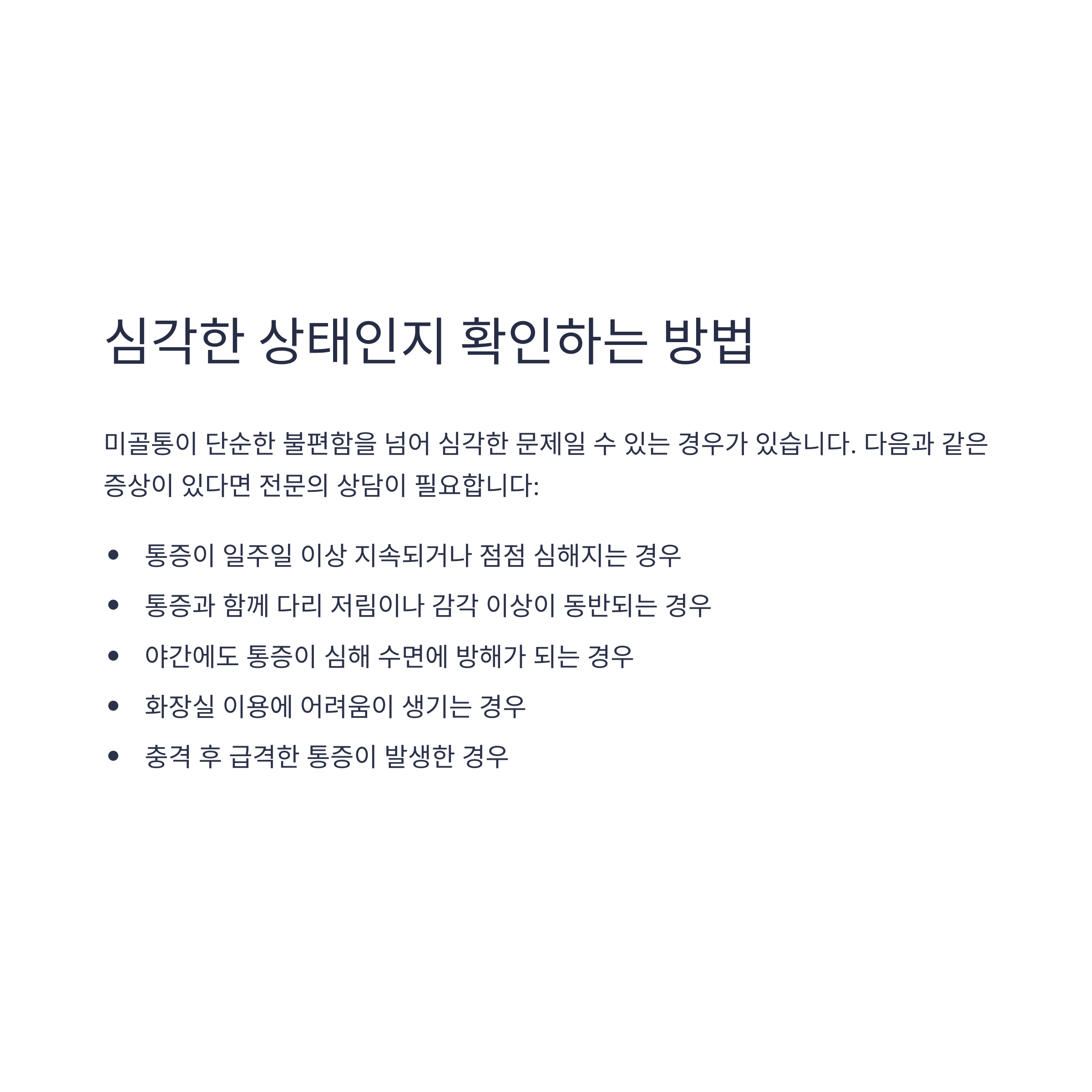 단순한 피로가 아니라면 아래와 같은 증상이 있다면 미골통을 의심해볼 수 있어요.