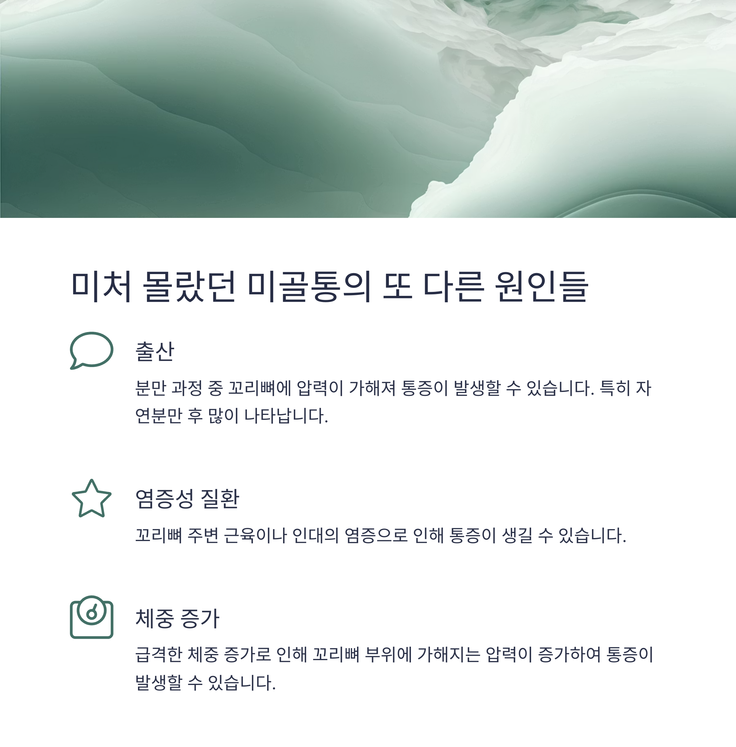 | 출산 | 분만 과정 중 꼬리뼈에 압력이 가해져 통증이 생기는 경우 |