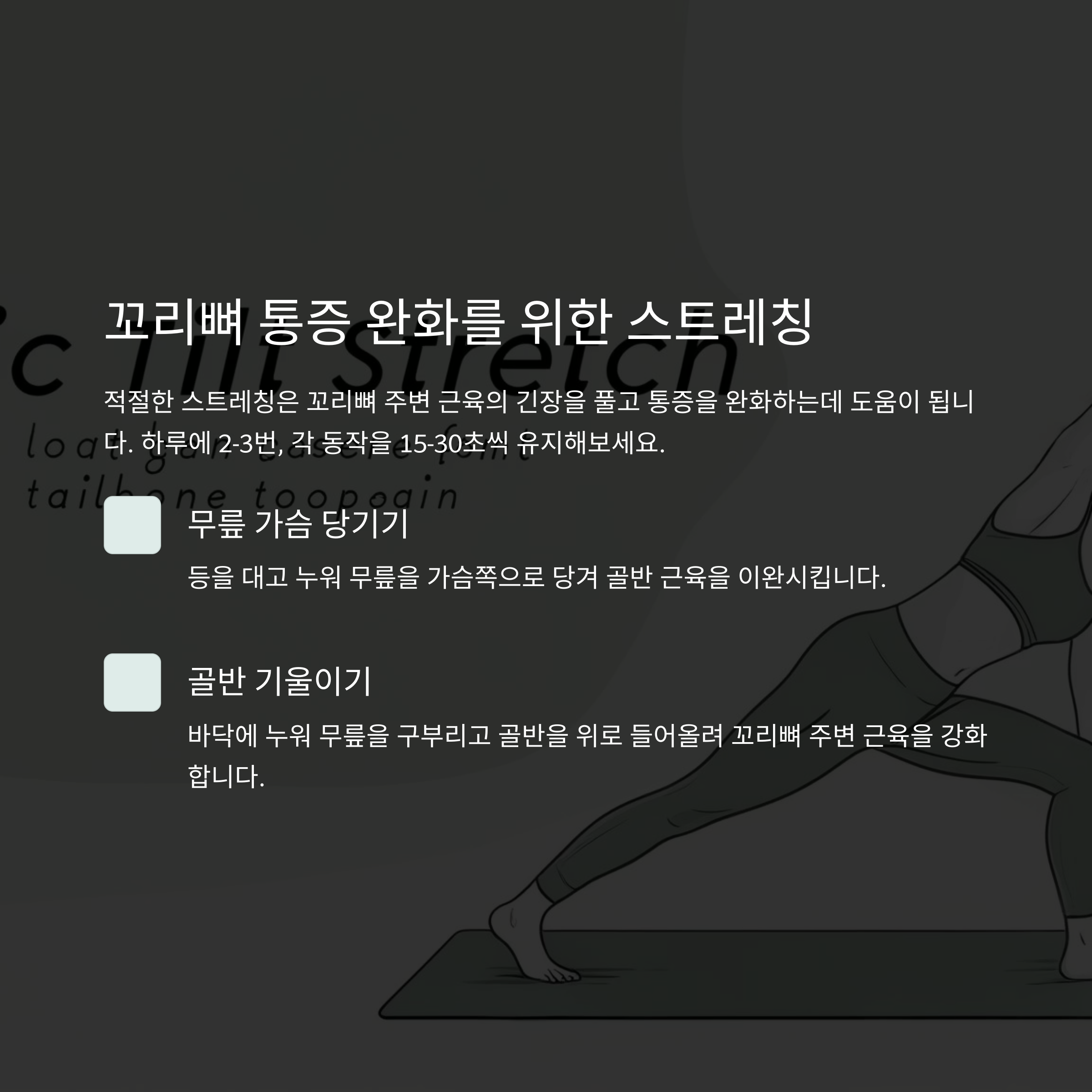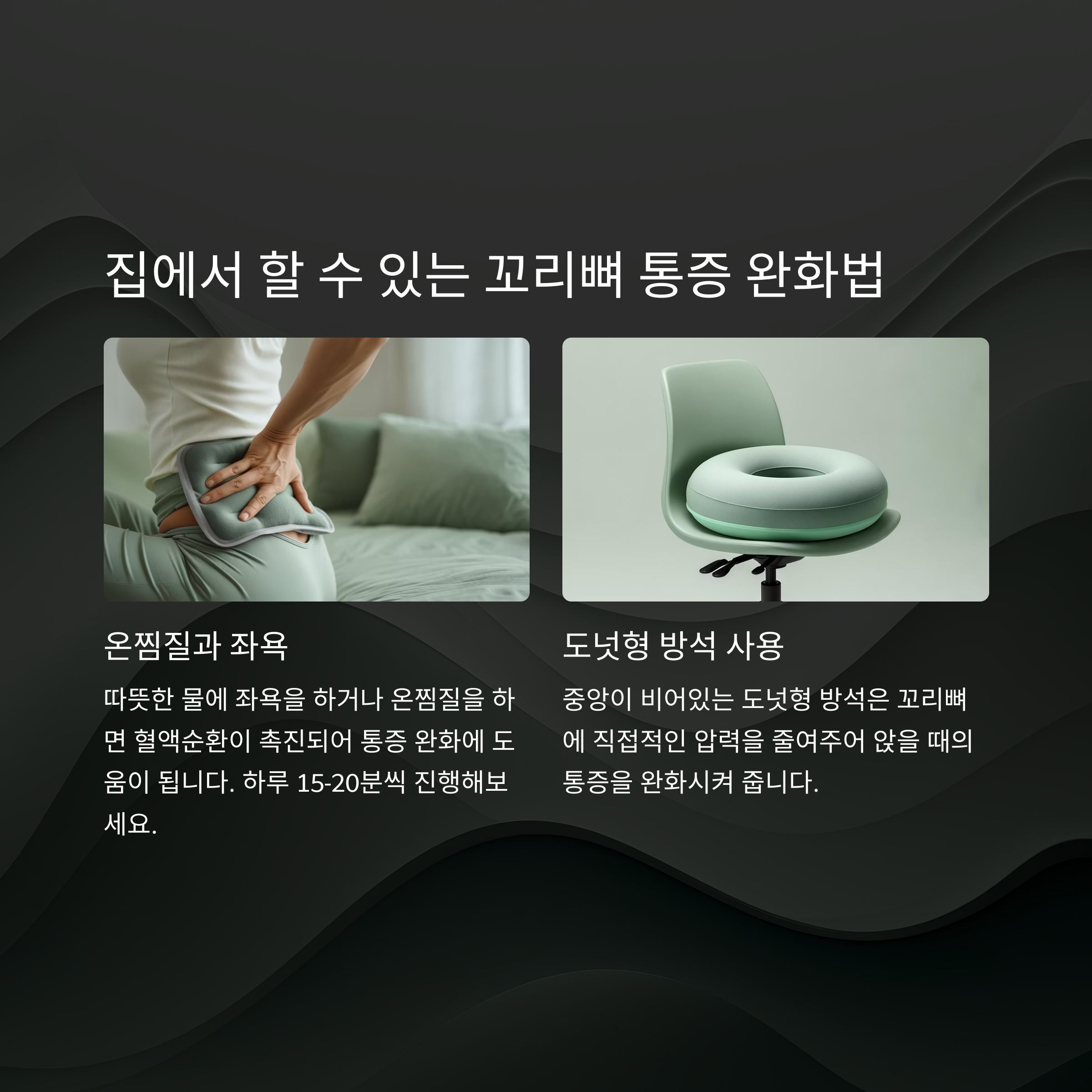 - 도넛형 방석 사용: 앉을 때 꼬리뼈 압력을 줄여줌