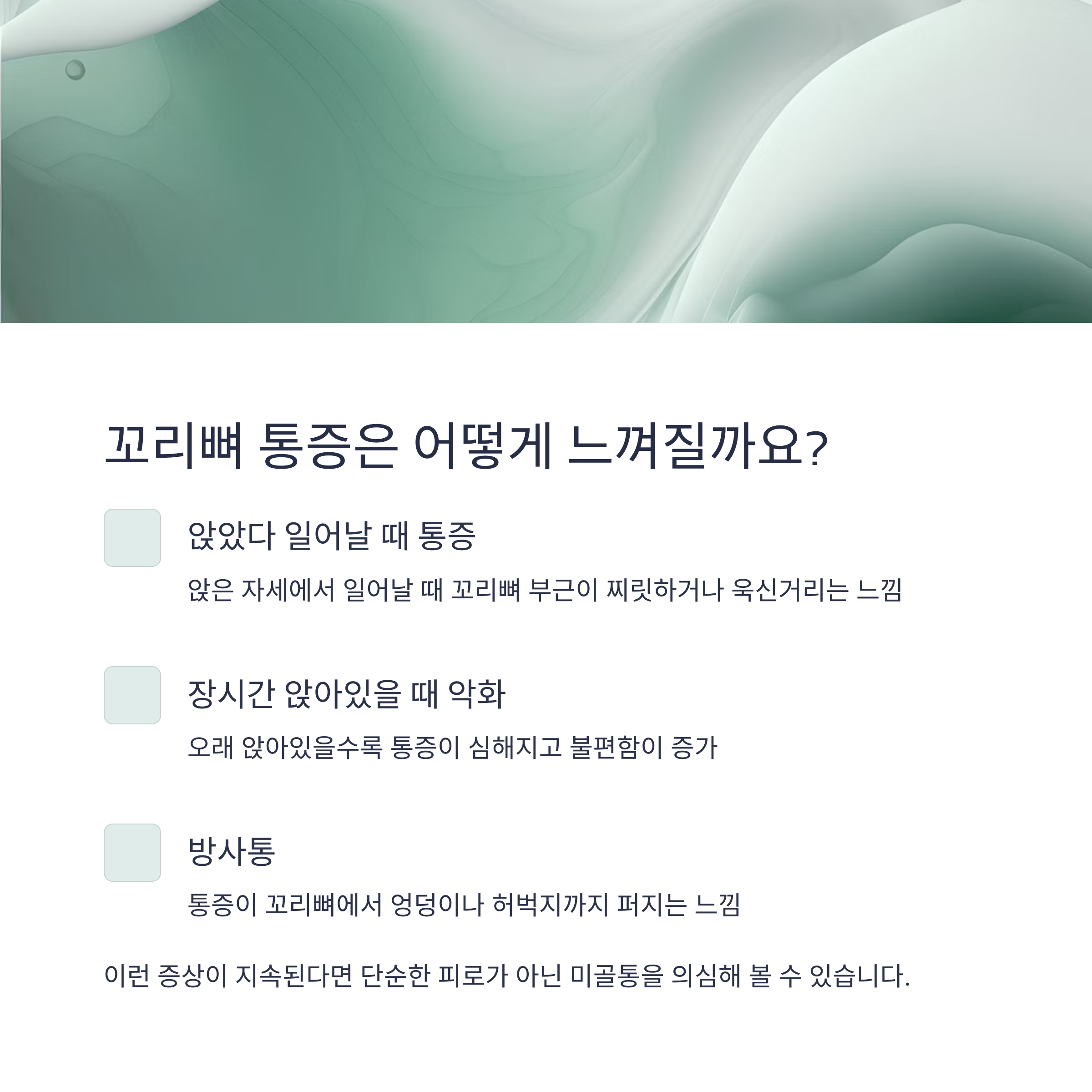 - 앉았다 일어날 때 꼬리뼈 부근이 찌릿하거나 욱신거림