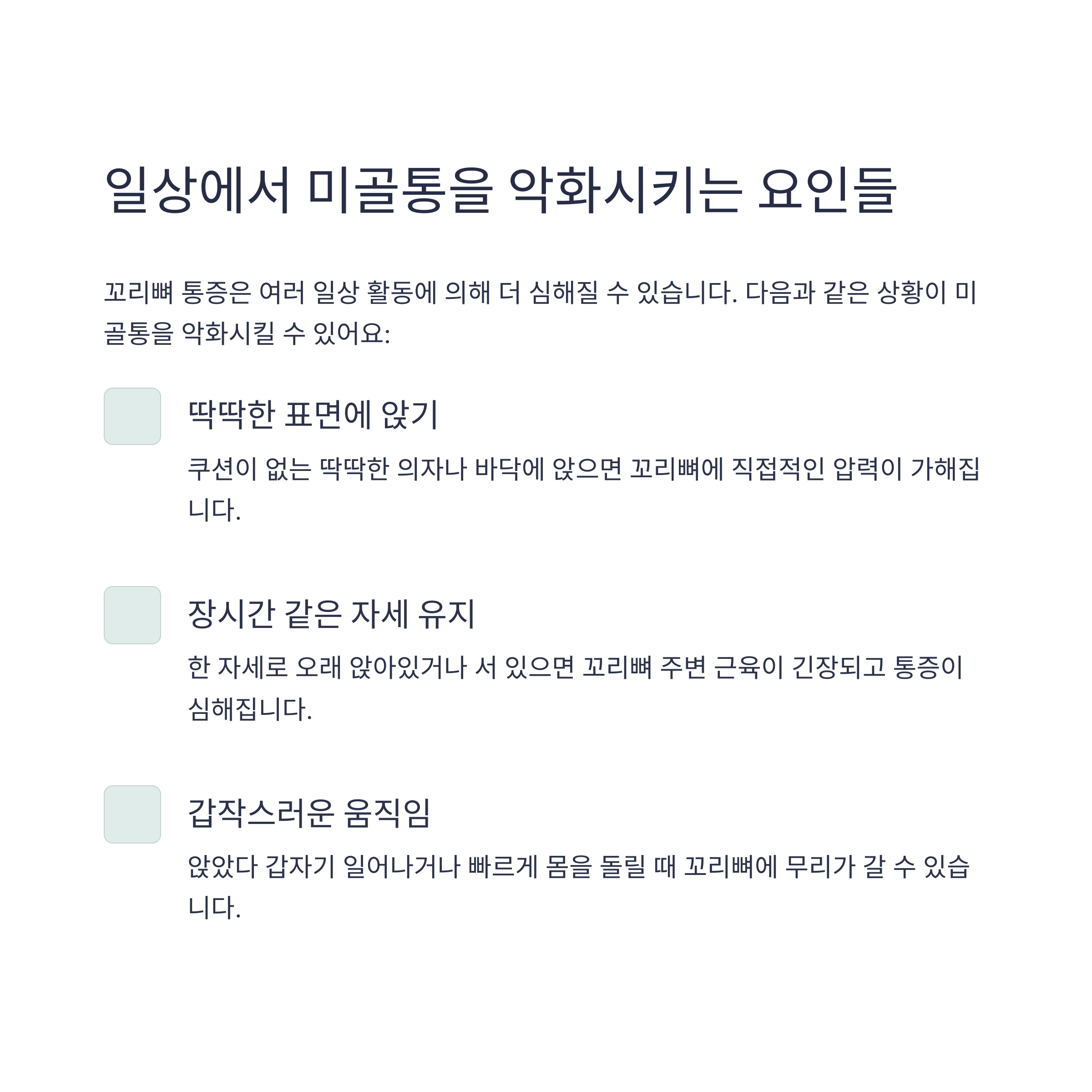 | 장시간 앉기 | 딱딱한 의자에서 오래 앉아 있을 때 꼬리뼈에 압력이 집중됨 |