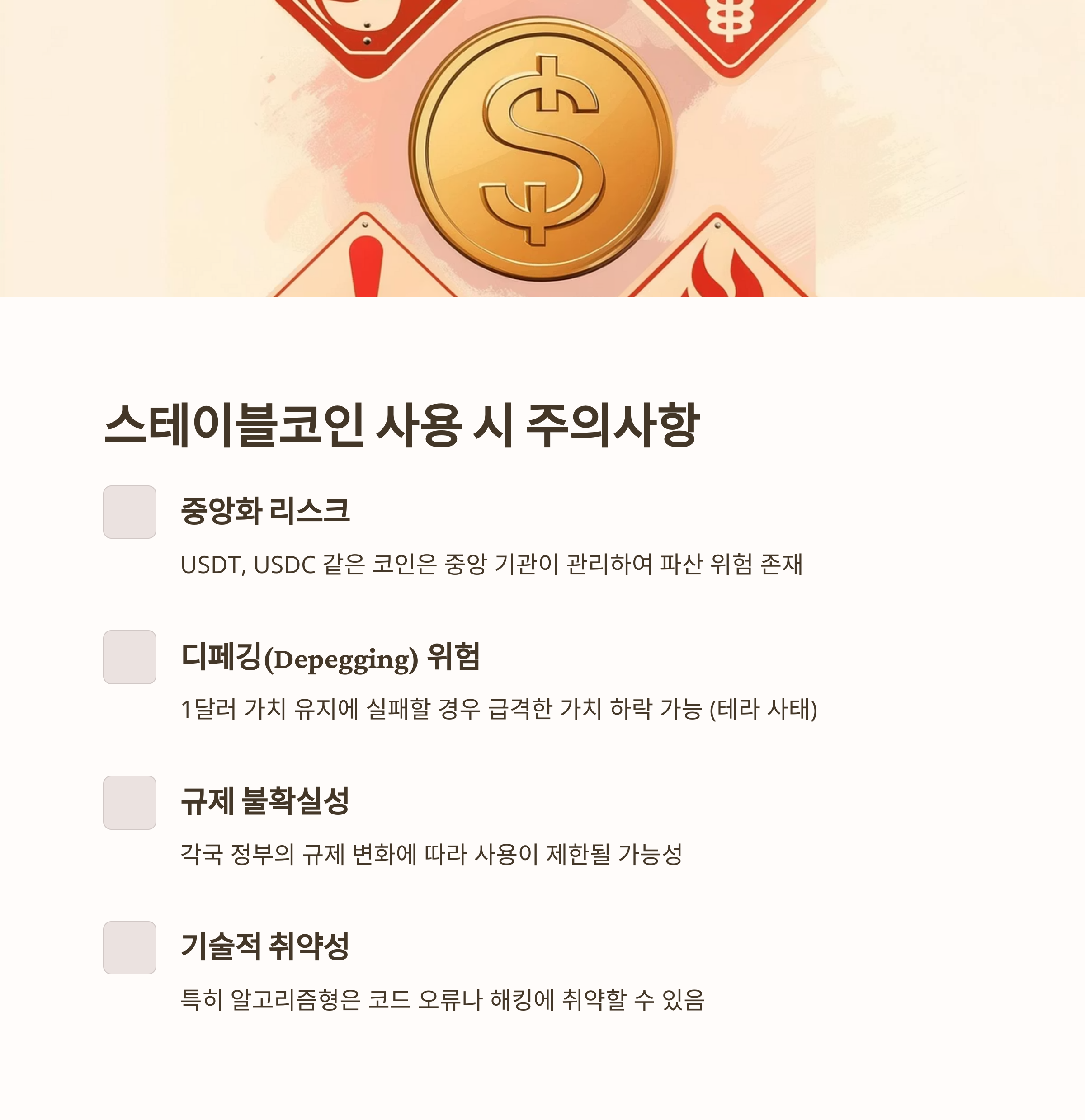 - 중앙화 리스크 – USDT, USDC 같은 코인은 중앙기관이 관리하는 만큼 파산·도피 리스크 존재