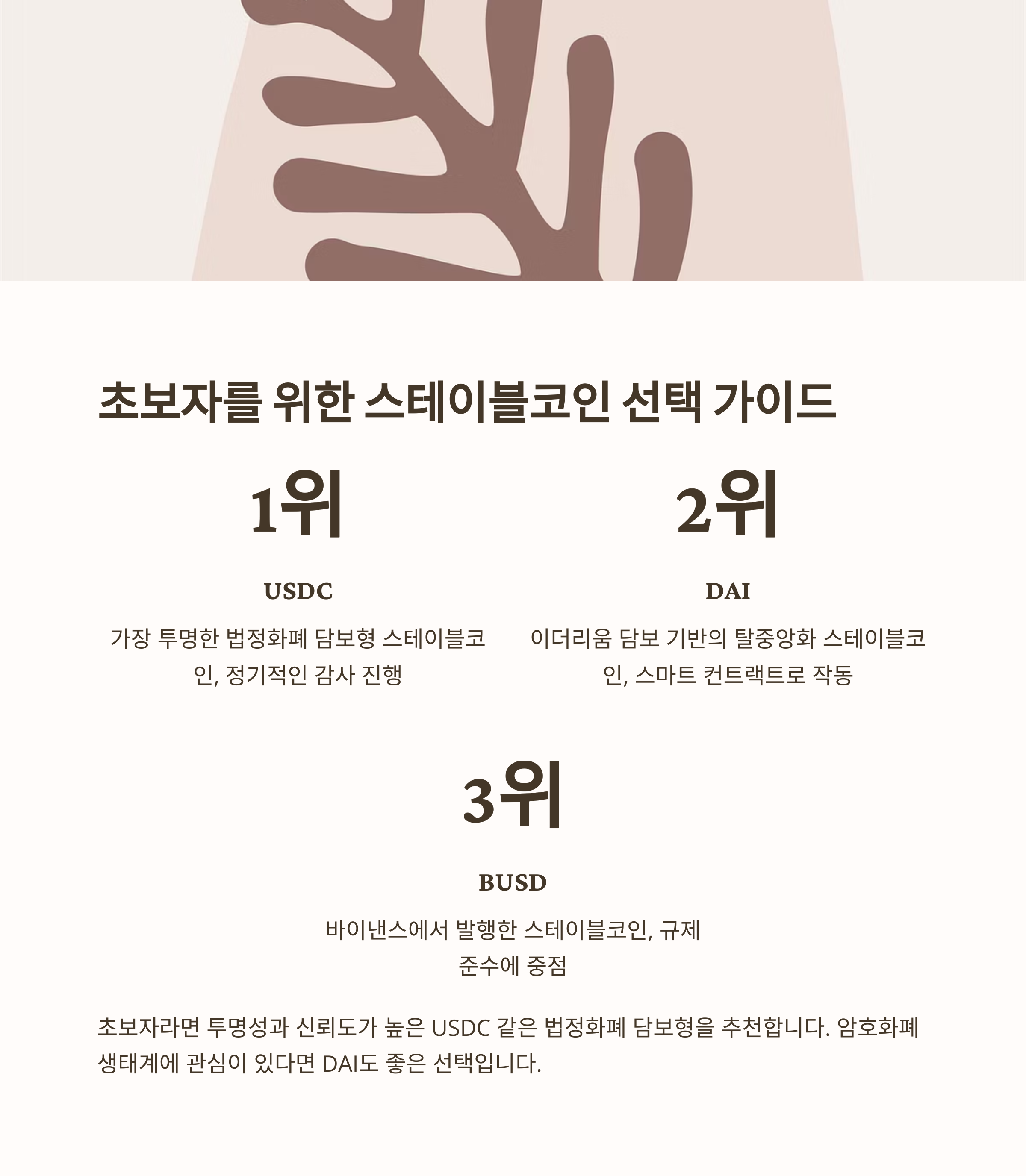 일반 사용자라면 투명성과 신뢰도가 높은 USDC 같은 법정화폐 담보형을 추천드려요. 탈중앙화에 관심이 있다면 DAI도 좋은 선택이고요.