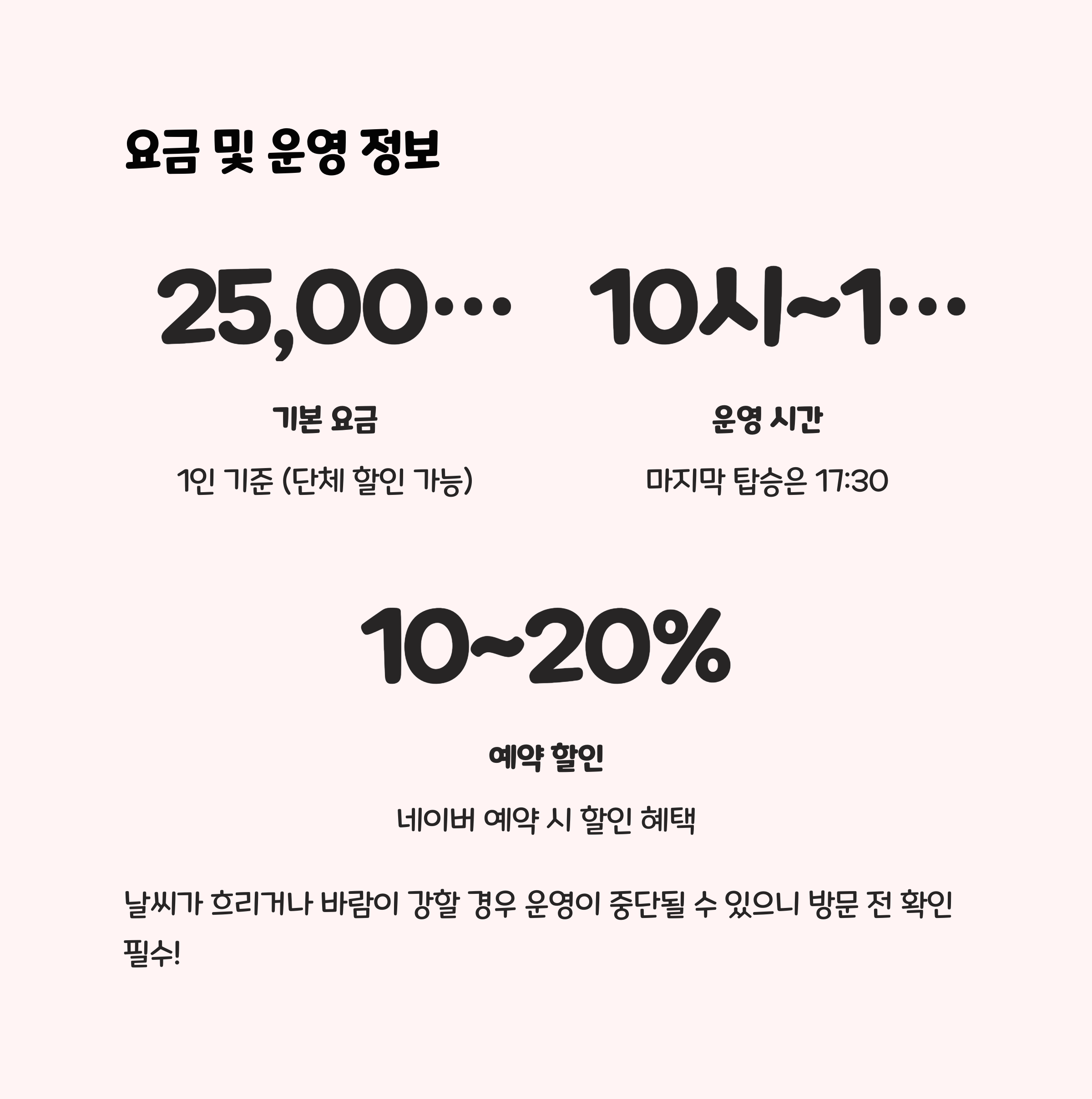 운영은 오전 10시부터 오후 6시까지예요. 마지막 탑승은 5시 30분 정도에 마감되니 늦지 않게 도착하는 게 좋아요. 날씨가 흐리거나 바람이 세면 일시 중단되기도 하니까 가기 전에 공식 홈페이지나 SNS 체크는 필수! 가격은 기본 1인 25,000원부터 시작하고, 단체 할인이나 사전예약 시 더 저렴하게 즐길 수 있어요.