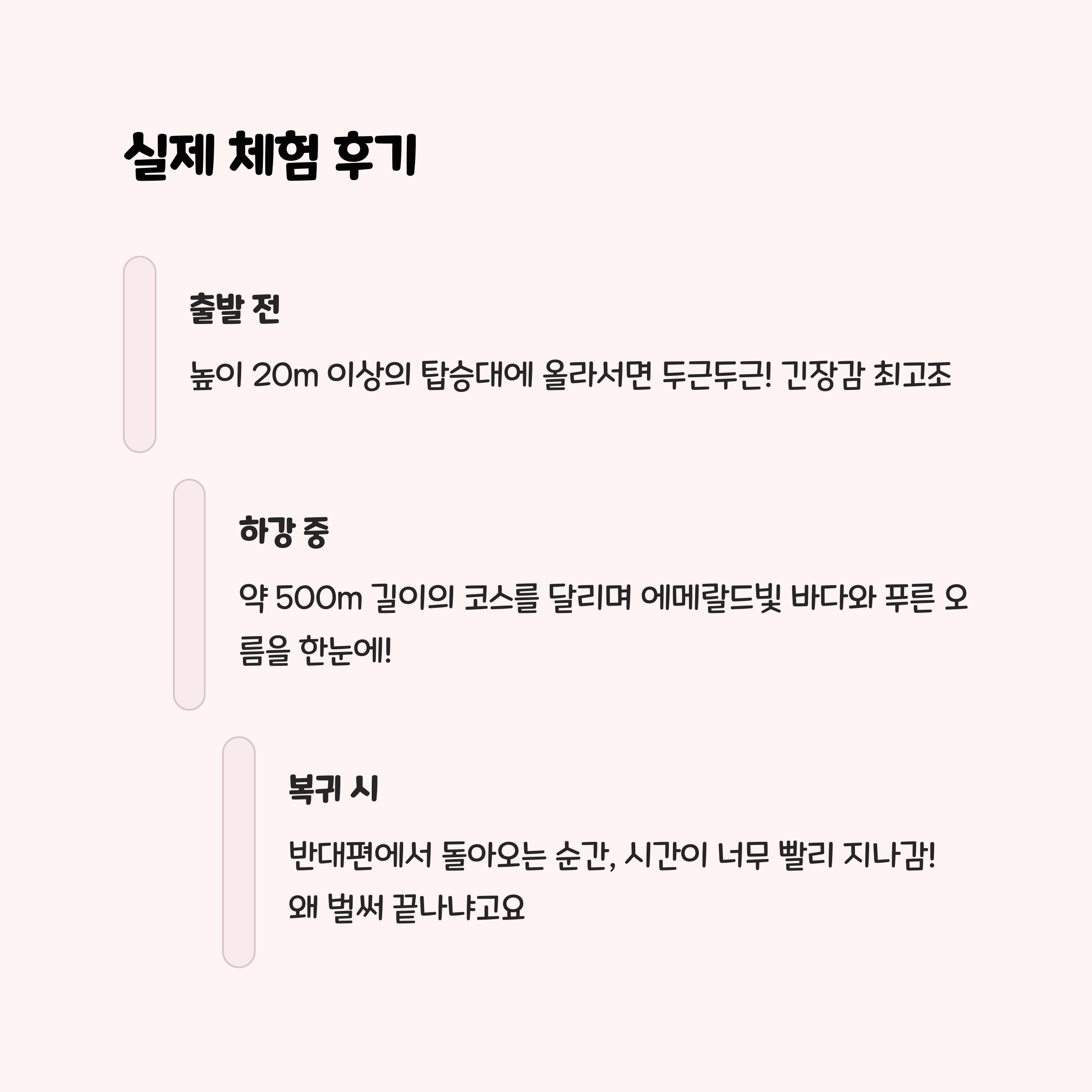 처음에 탑승대에 올라섰을 땐 솔직히 다리가 후덜덜했어요. 하지만 출발하자마자 그 공포는 날아가고, 대신 와— 하는 탄성이 절로 나옵니다. 내려가는 길에 펼쳐지는 에메랄드빛 제주 바다와 오름이 장관이고요, 다시 반대편에서 돌아올 때는 ‘어? 끝났나?’ 싶을 만큼 시간이 휘리릭 지나가요.