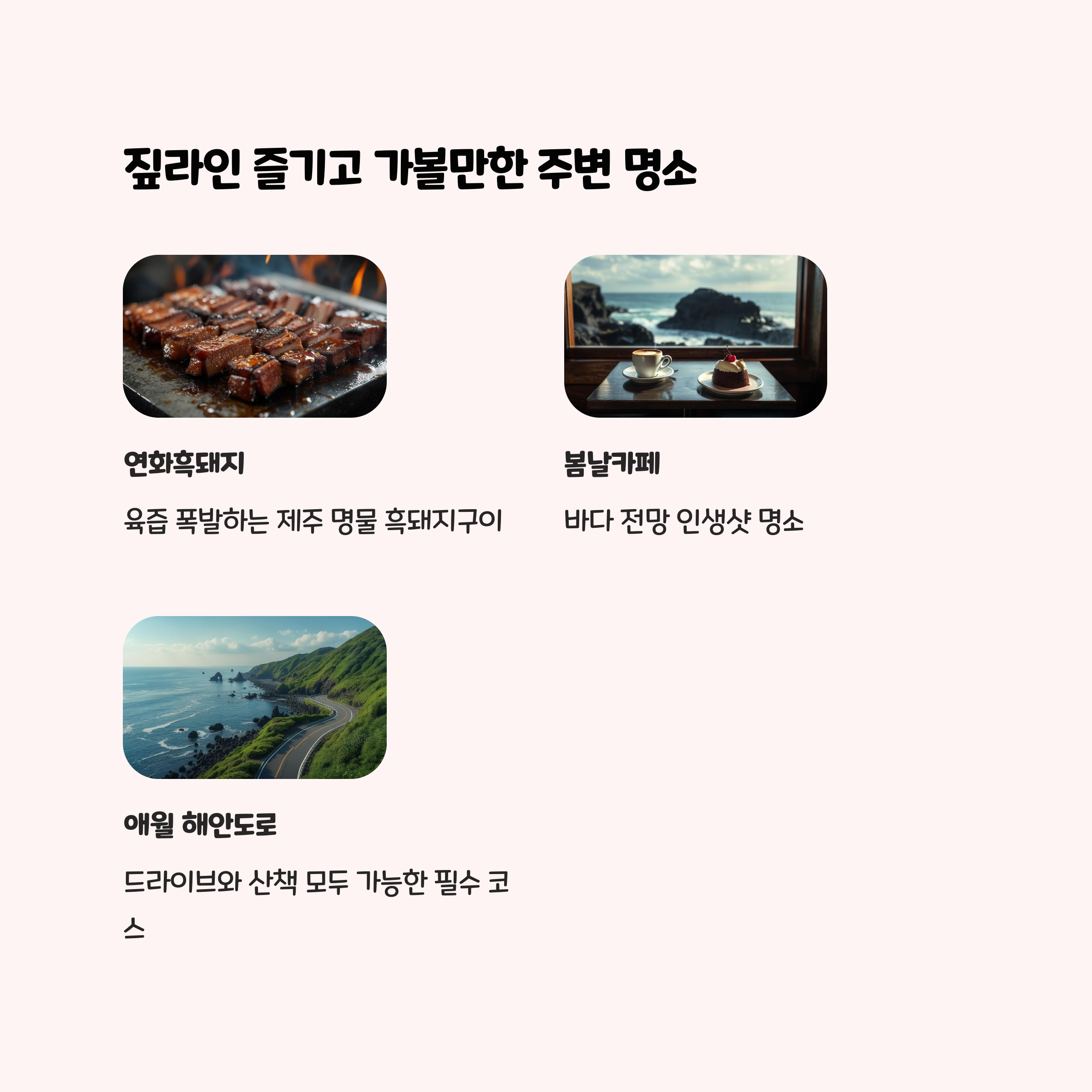 짚라인 끝나고 근처 어디 갈까 고민되시죠? 다행히 주변에 좋은 곳 많아요. 바다도 가깝고, 드라이브 코스도 끝내줘요. 특히 애월 카페거리는 인생샷 찍기 좋은 명소예요. 배고프면 흑돼지구이 or 갈치조림 어떠세요? 현지인 추천 맛집 리스트도 공유해드릴게요!
