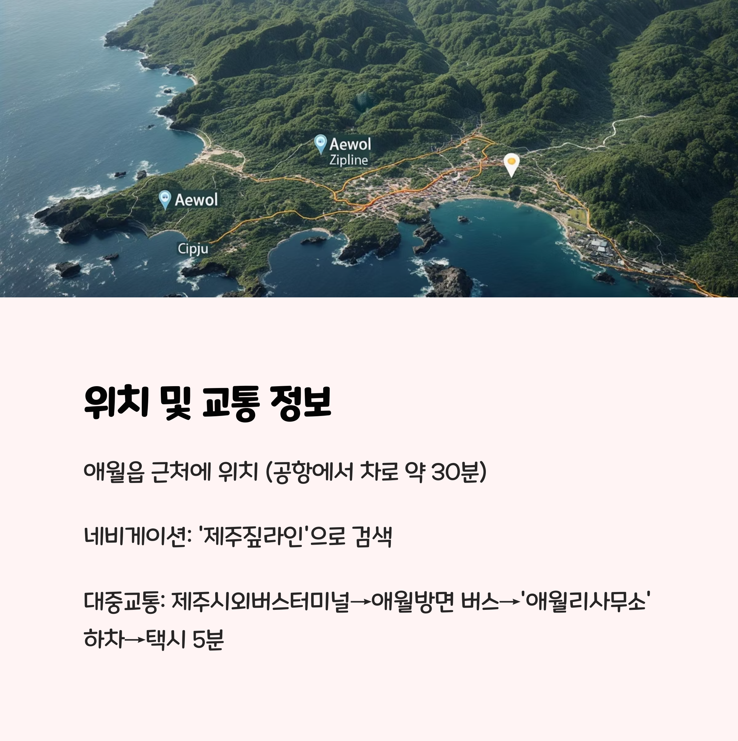 제주 왕복 짚라인은 애월읍 근처에 위치해 있어요. 공항에서 차로 약 30분 정도 걸리고요, 주변에 바다와 숲이 어우러진 풍경이 정말 압권입니다. 렌트카로 이동하면 가장 편하지만, 대중교통도 가능해요. 제주시외버스터미널에서 애월 방면 버스를 타고 ‘애월리사무소’ 정류장에서 하차한 뒤 택시로 5분이면 도착! 참고로 네비에는 ‘제주짚라인’이라고만 쳐도 정확하게 나옵니다.