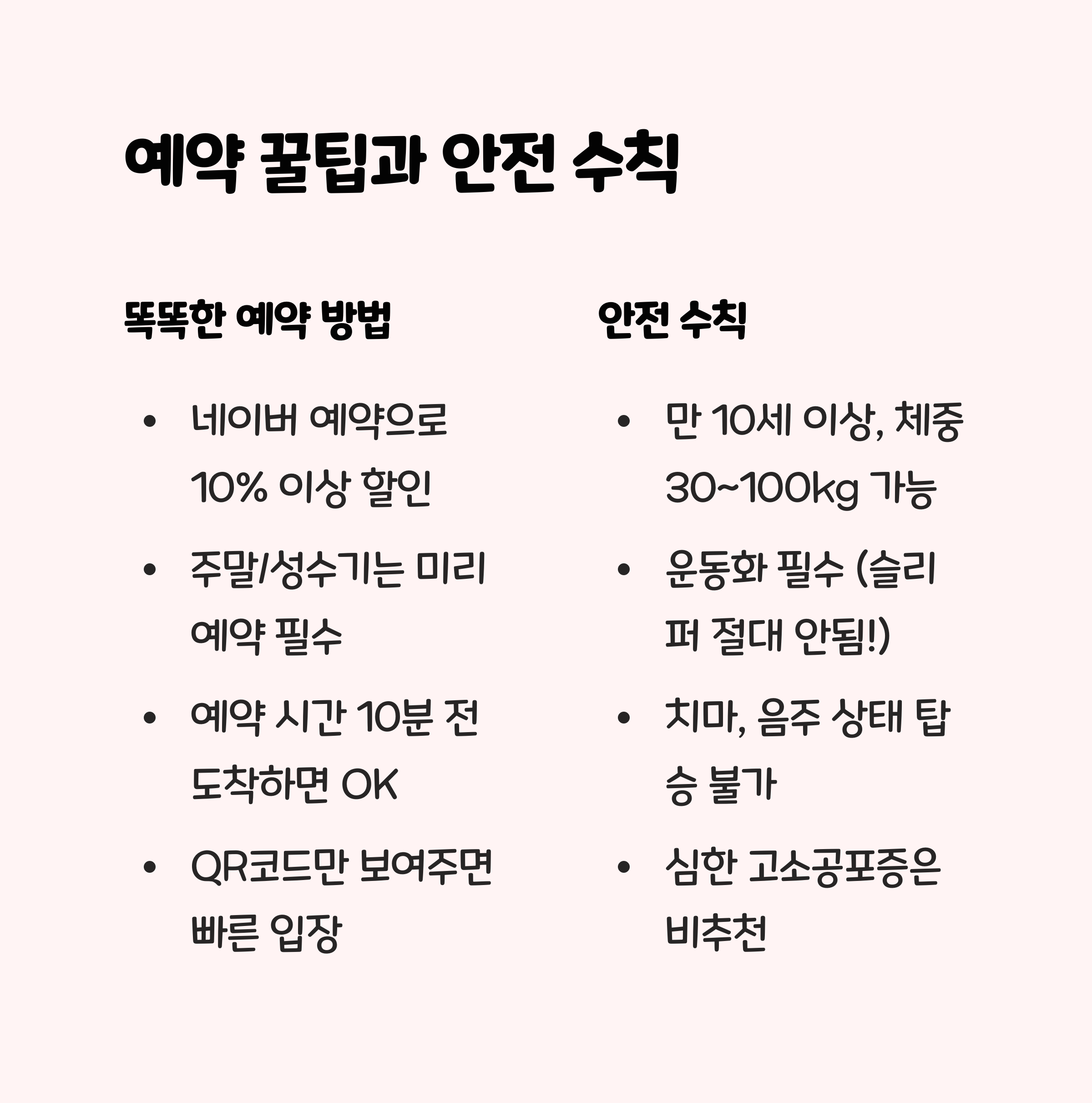 | 금지사항 | 슬리퍼, 치마, 음주 상태, 고소공포증 심한 경우 |