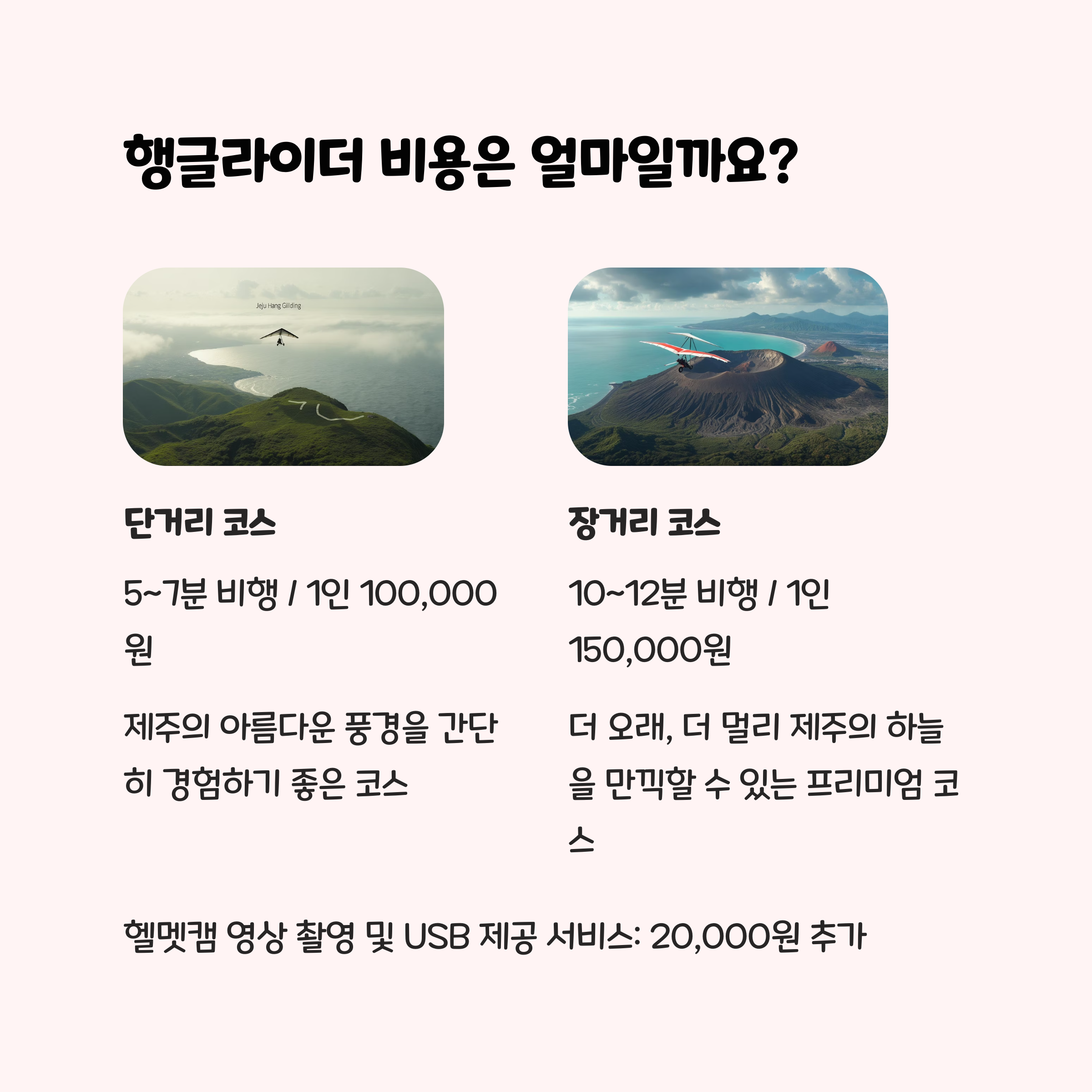 행글라이더는 단거리 체험과 장거리 비행 두 가지 코스로 나뉘어요. 단거리는 약 5분~7분 정도, 장거리는 10분 이상 하늘을 날 수 있어요. 금액은 코스에 따라 다르며, 영상 촬영 옵션 포함 시 추가 요금이 발생합니다.