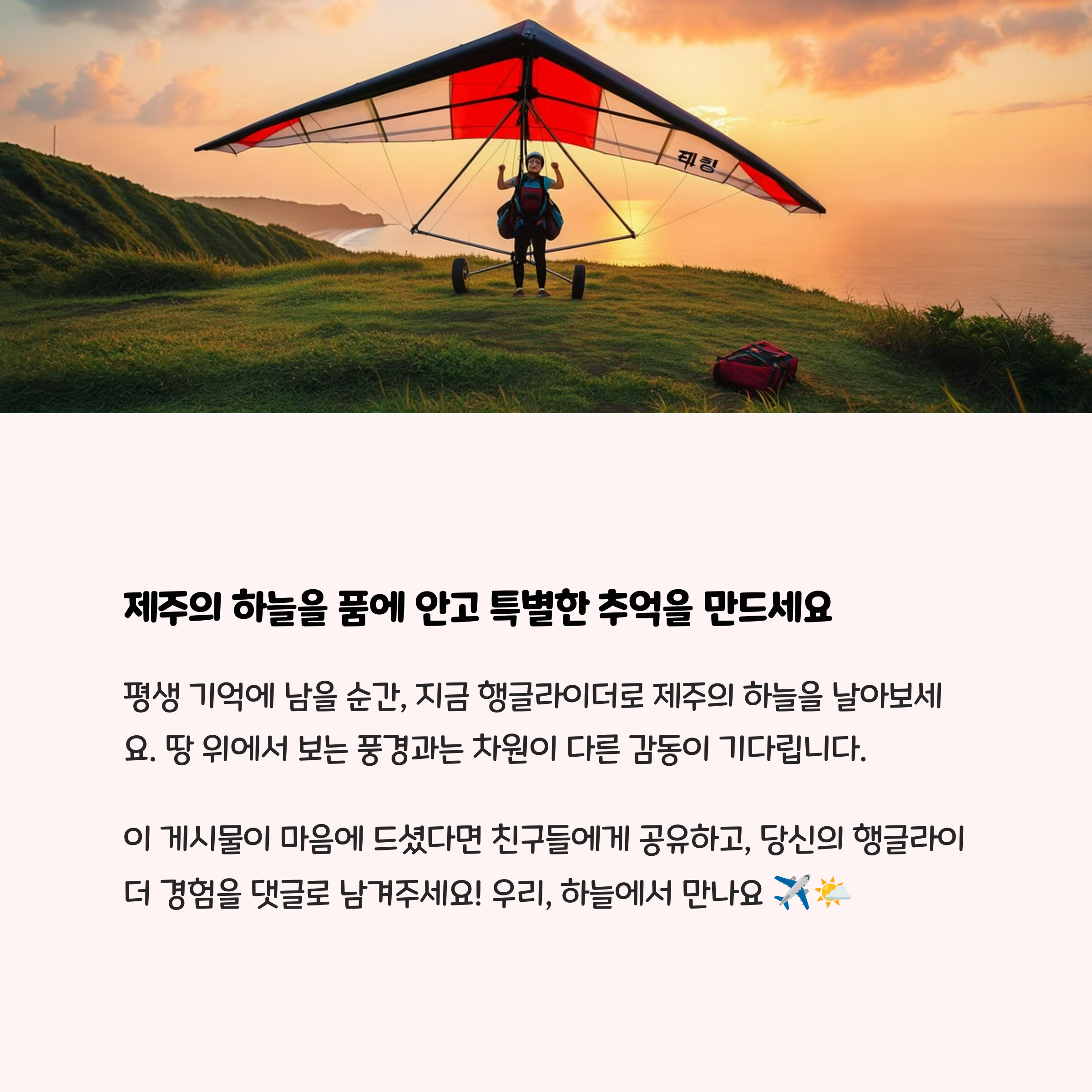 제주에서의 하늘 여행, 정말 꿈같은 시간이었어요. 평생 기억에 남을 순간을 만들고 싶다면, 행글라이더는 정말 후회 없는 선택이에요. 땅 위에서 보는 풍경과는 차원이 다르고, 그 순간의 바람, 공기, 빛까지 모두 선명하게 남아 있어요. 무언가 특별한 여행을 찾고 있다면, 주저하지 말고 도전해보세요! 경험하신 분들, 댓글로 감상도 나눠주세요. 우리, 하늘에서 만나요 ✈️🌤️