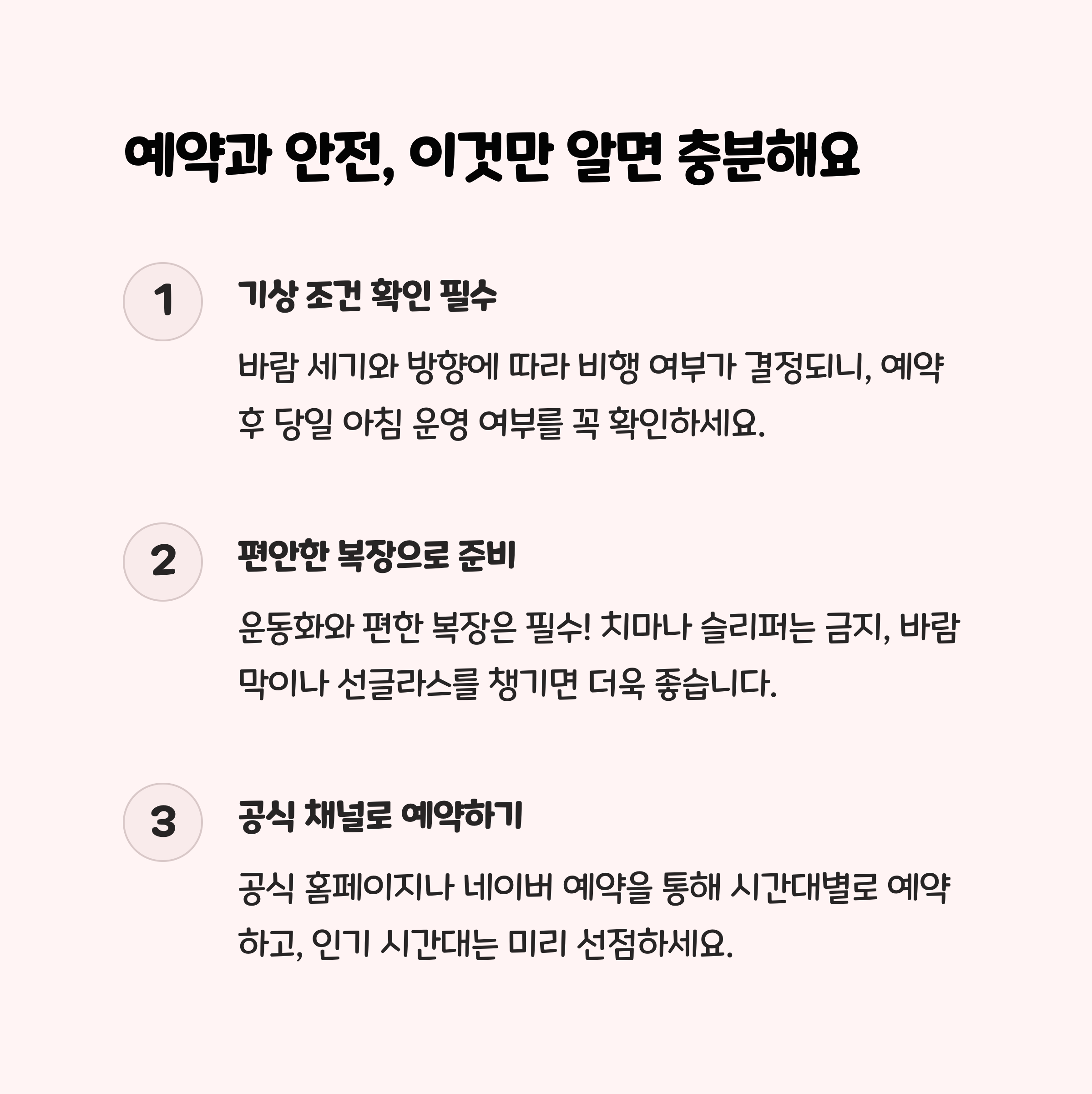 행글라이더는 기상 조건에 민감한 체험이에요. 특히 바람 세기와 방향에 따라 비행 여부가 바뀌므로, 예약 후 당일 아침 운영 여부를 꼭 확인하세요. 대부분 카카오톡이나 전화로 빠르게 안내받을 수 있어요. 예약은 공식 홈페이지 또는 네이버 예약을 이용하면 되고, 시간대별 예약제라 미리 원하는 시간대를 지정해두는 게 좋아요.