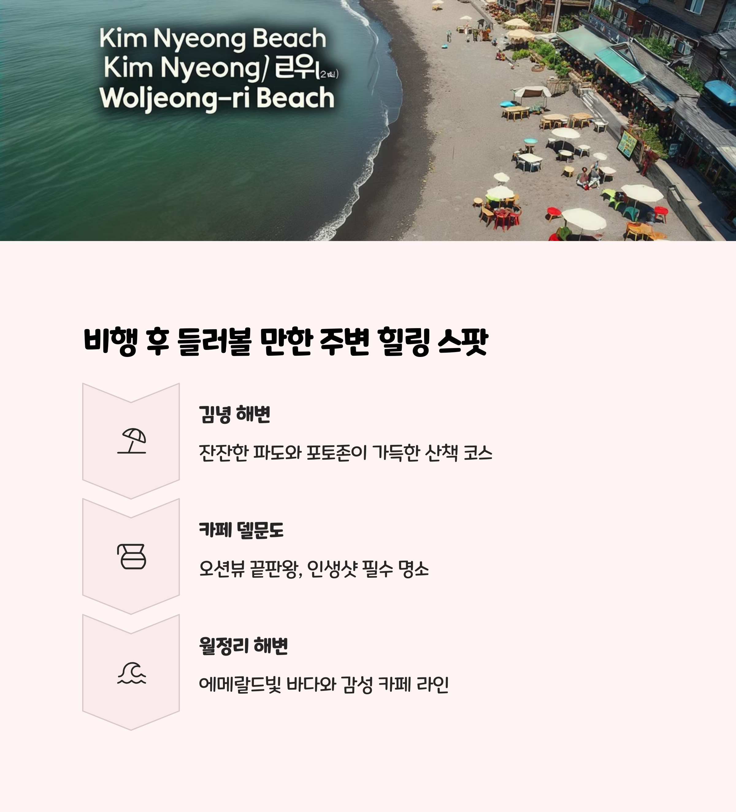 비행 후에는 감성이 몽글몽글해지잖아요. 주변에도 딱 어울리는 힐링 스팟들이 있어요. 특히 김녕 해변이나 월정리 해변 쪽으로 이동하면 카페 투어하기도 좋아요. 푸른 제주 바다를 보며 여유롭게 커피 한 잔, 상상만 해도 좋지 않나요?