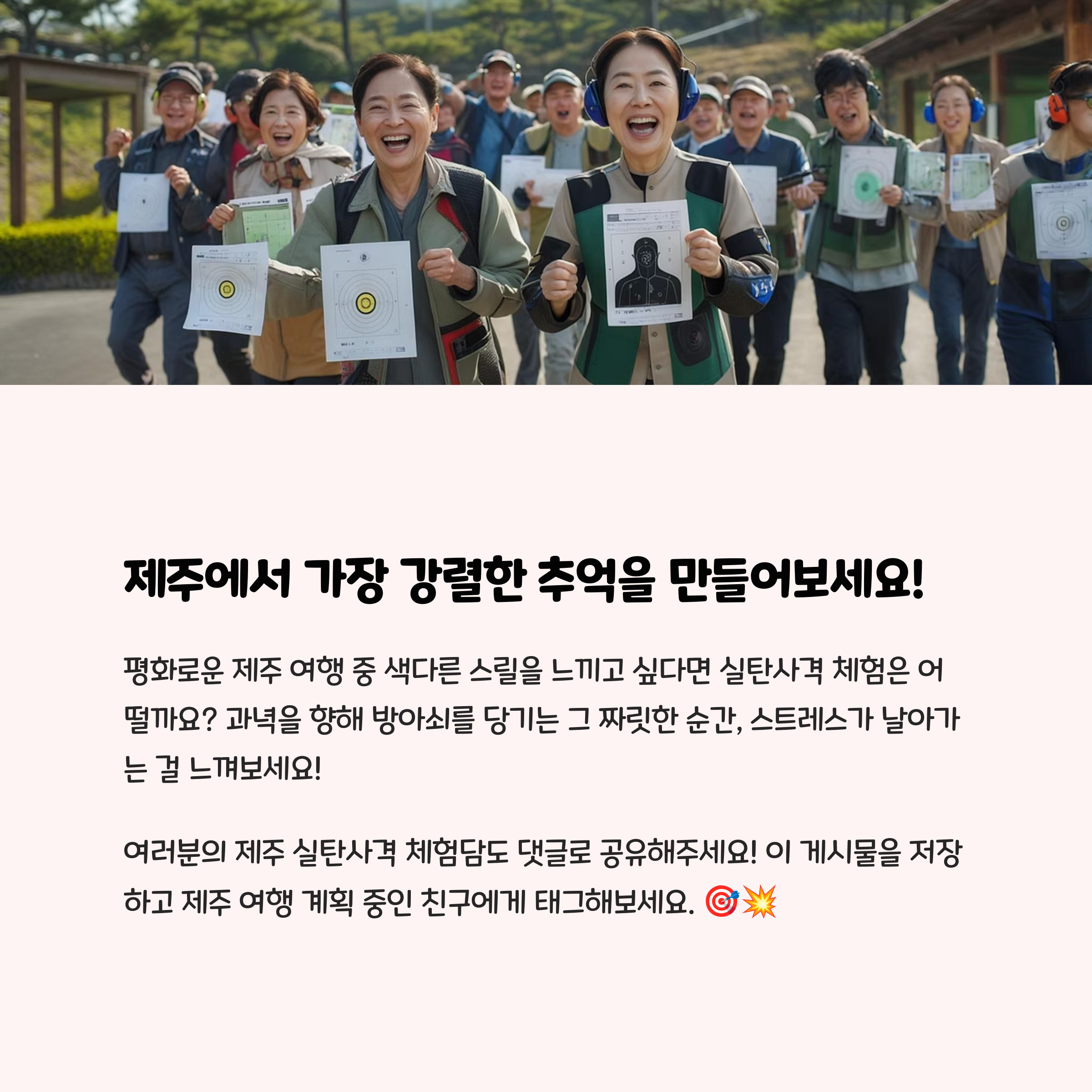 제주에서 가장 강렬했던 순간을 꼽으라면 단연 실탄사격장이었어요. 총 한 자루 들고 과녁을 마주했을 때의 긴장감, 첫 발사 후 느껴지는 손의 진동, 그리고 그 짜릿한 쾌감! 평소와는 완전히 다른 에너지를 느낄 수 있었던 시간이었습니다. 제주의 감성도 좋지만, 이렇게 색다른 액티비티도 한 번쯤은 꼭 도전해보시길 바라요. 혹시 다녀오신 분 있다면 댓글로 경험 공유도 대환영이에요! 🎯💥