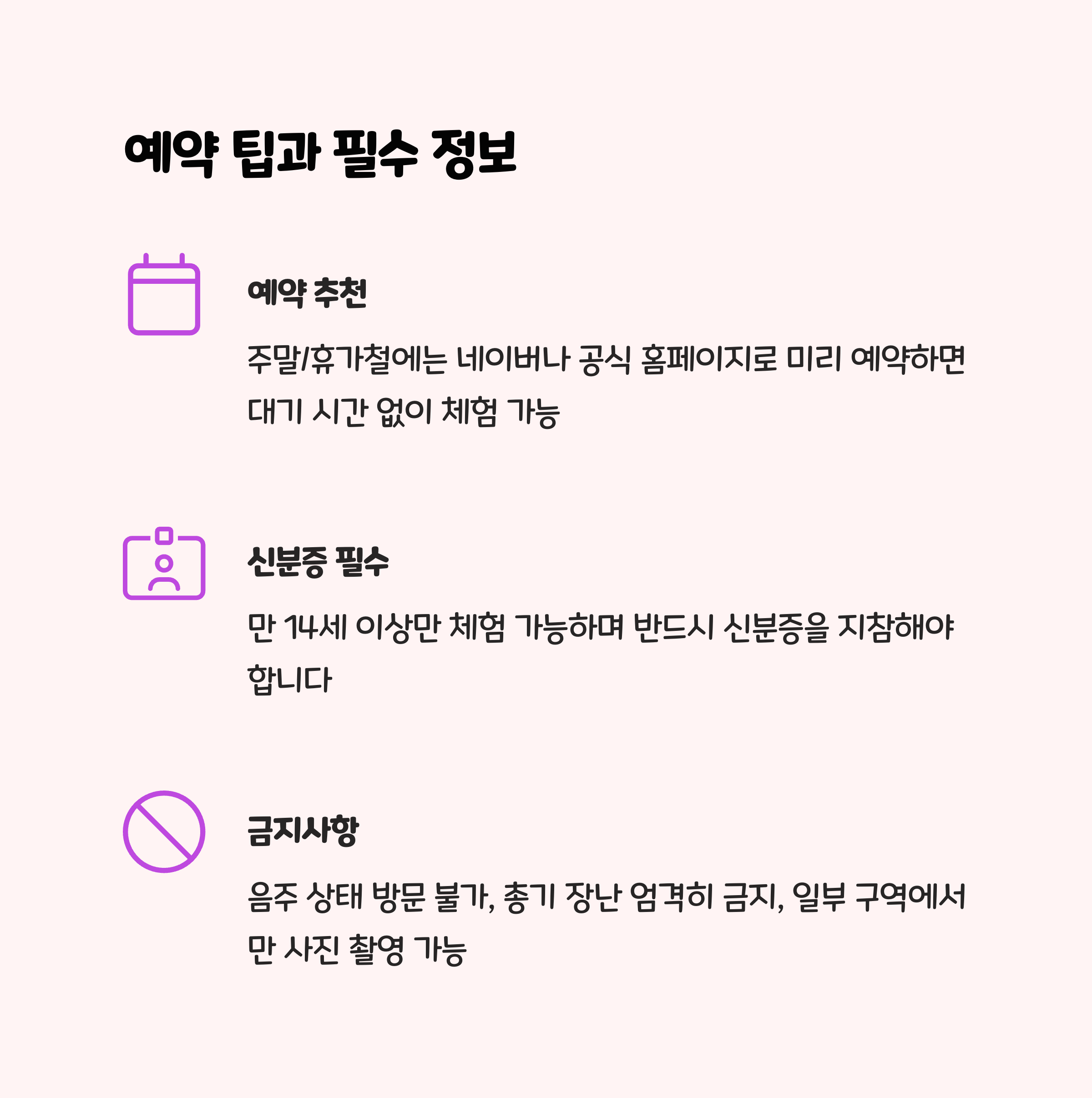 실탄사격장은 예약 없이 방문해도 가능하지만, 특히 주말이나 휴가철에는 대기 시간이 길 수 있어요. 네이버 예약 또는 공식 홈페이지를 통해 미리 시간대를 예약하면 훨씬 쾌적하게 즐길 수 있어요. 사격 전에는 신분증 지참 필수이며, 음주 상태는 절대 불가예요. 또, 만 14세 이상부터 체험 가능하니 가족 단위 방문 시 참고하세요!