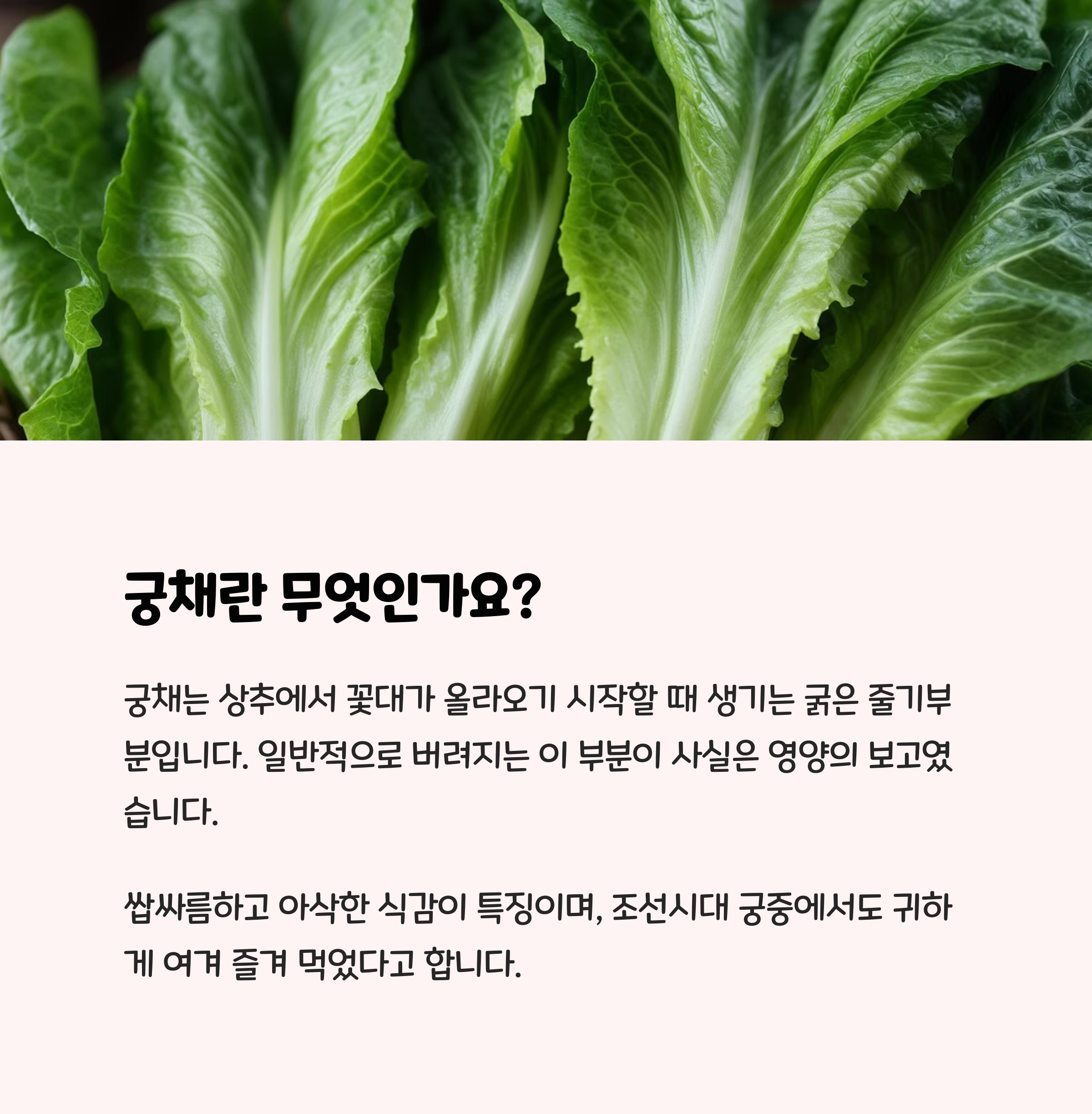 궁채는 상추의 줄기 부분으로, 꽃대가 올라올 때 생기는 줄기를 잘라 먹는 채소입니다. 일반 상추와는 식감과 영양이 다릅니다.