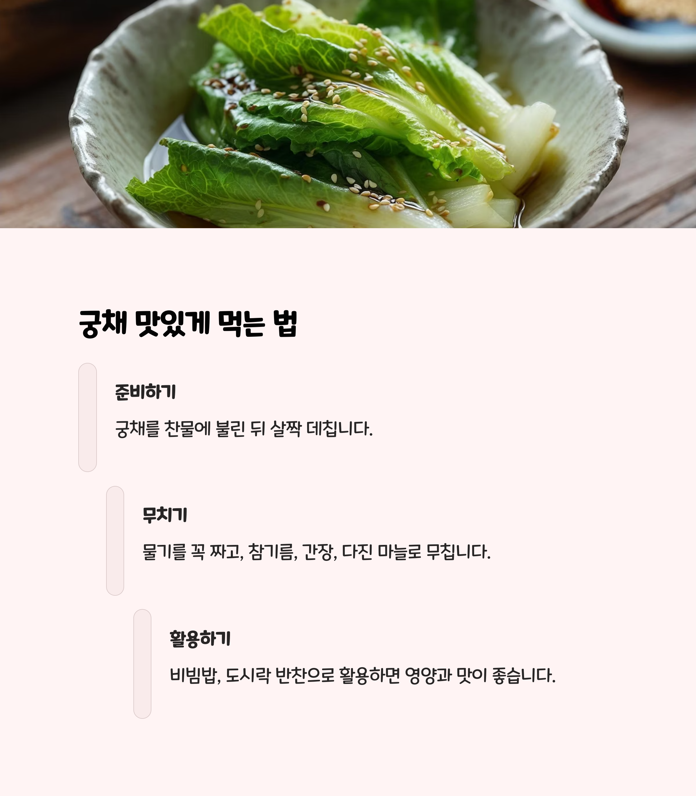 궁채는 말려서 불린 후 사용하는 게 일반적이에요. 데친 다음 물기를 꼭 짜서 무침으로 먹거나, 나물 반찬, 비빔밥에 넣으면 아삭하고 쌉싸름한 맛이 정말 매력적이에요. 궁중 느낌 제대로 나는 반찬이라 손님상에도 손색없어요!