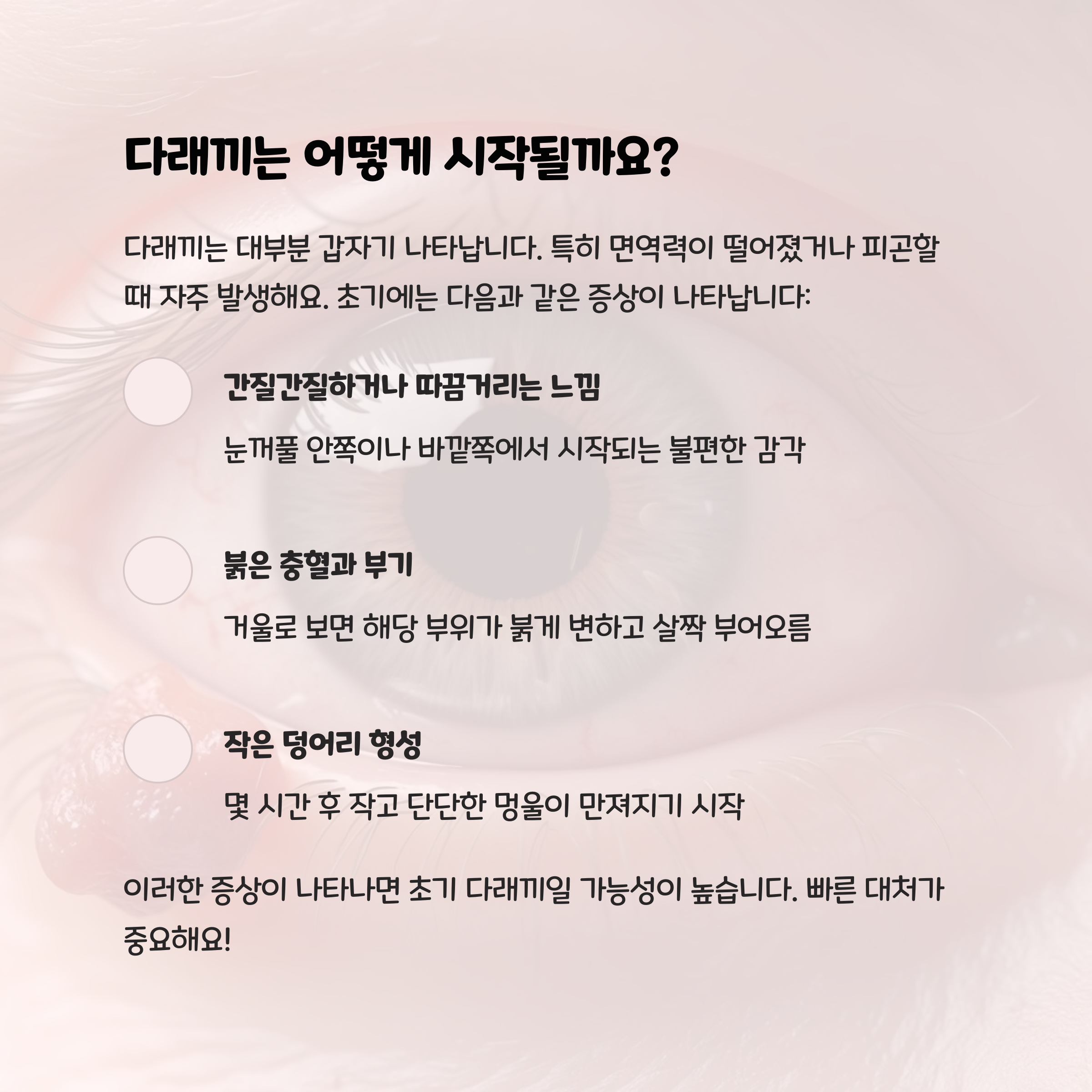 다래끼는 갑자기 나타나는 경우가 많아요. 특히 피곤하거나 면역력이 떨어졌을 때 자주 생기죠. 보통 처음에는 눈꺼풀 안쪽이나 바깥쪽이 간질간질하거나 약간 따끔거려요. 거울을 보면 붉게 충혈돼 있고, 살짝 부은 느낌도 들죠. 그 상태에서 몇 시간 지나면 작고 단단한 덩어리가 만져질 수 있어요. 바로 이게 다래끼의 시작이에요.