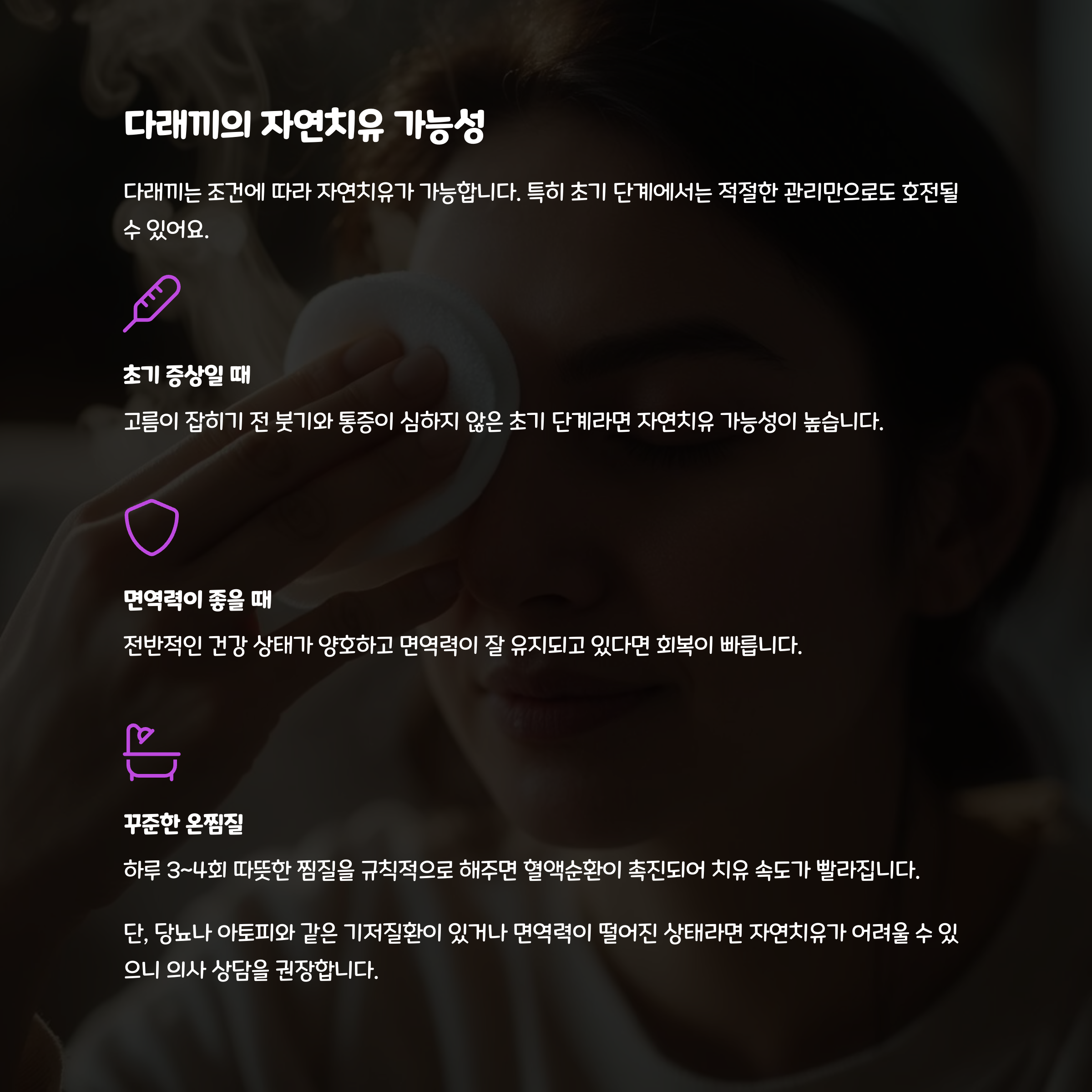 다래끼는 면역력이 괜찮고, 손으로 자극하지 않으면 며칠 내로 저절로 낫는 경우도 많아요. 특히 고름이 잡히기 전 초기단계라면 따뜻한 찜질만으로도 호전될 수 있어요. 단, 면역이 약하거나 당뇨, 아토피 등이 있는 경우엔 오히려 악화될 수 있으니 주의가 필요하죠.