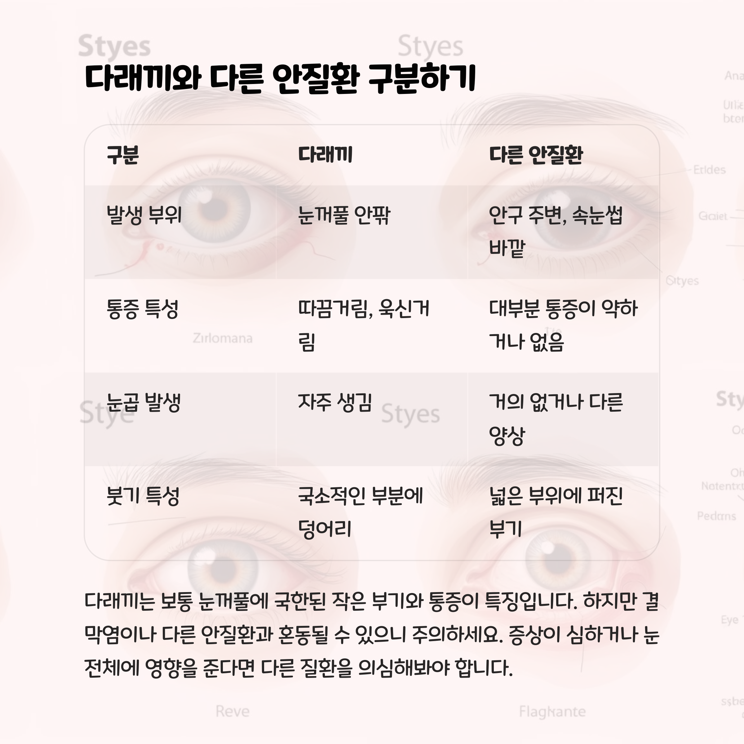 사실 다래끼는 병원 진단 없이도 어느 정도는 구분할 수 있어요. 하지만 다른 안질환과 혼동될 수 있으니 신중해야 하죠. 아래 표를 참고하면 도움이 될 거예요.